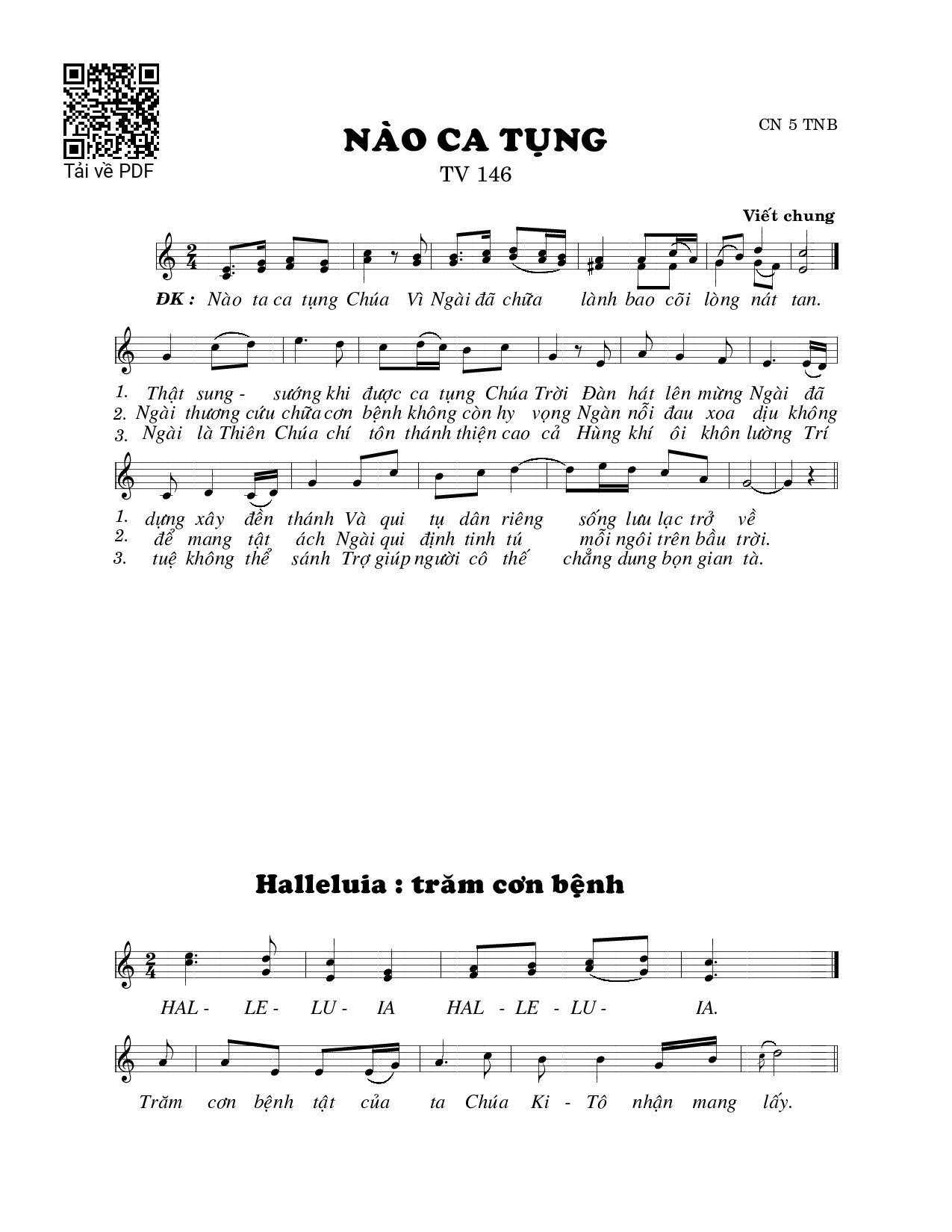 Sheet music Nào ca tụng (Thánh Vịnh 146) by Viết Chung and PDF file was posted here to support you to practice singing perfectly. Sheets with notes and chords are for reference only, for non-commercial purposes only, not involved with earning money by buying and selling. Copyright is belong to song writer/author and copyright owner. Truongca.com do not own any copyrighted content. You can download the high-quality PDF files which contain staffs by PDF link above.