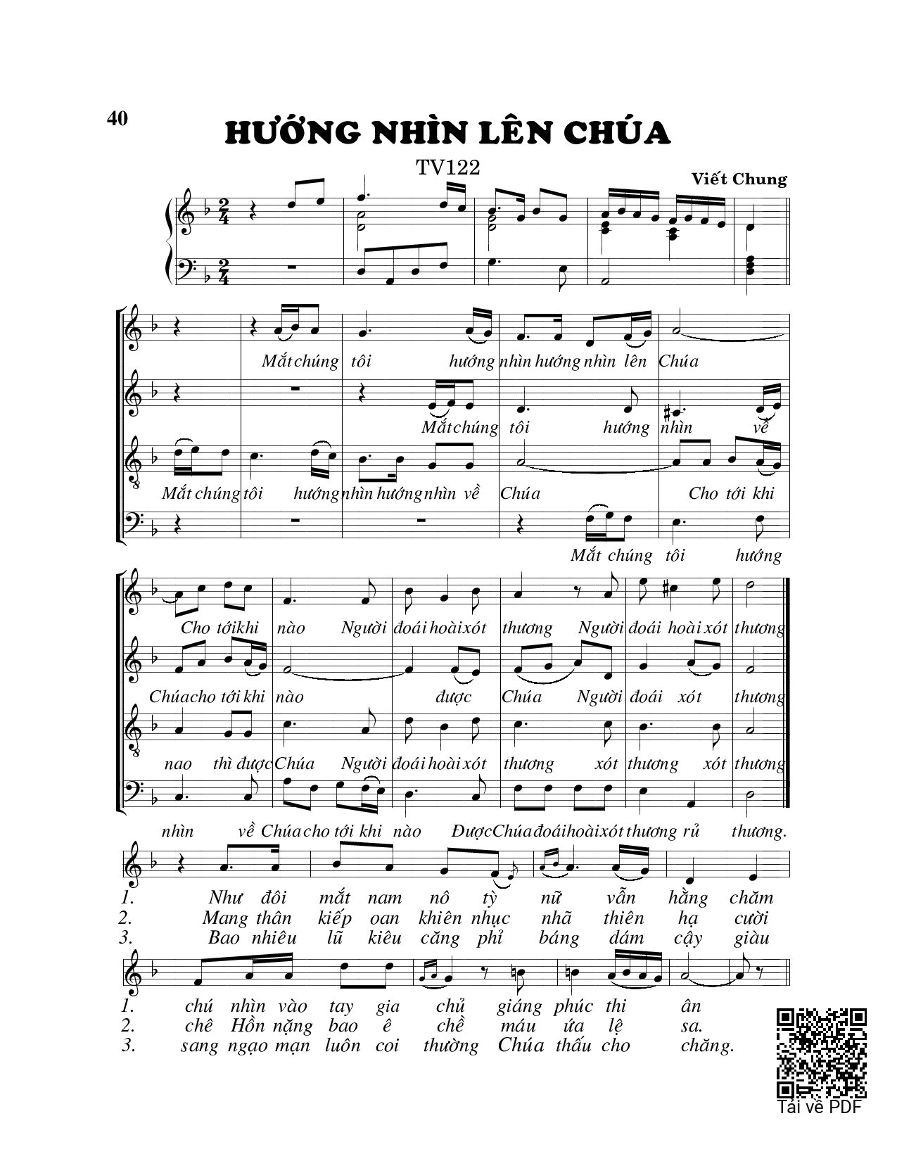 Sheet music Hướng nhìn lên Chúa (Thánh Vịnh 122) by Viết Chung and PDF file was posted here to support you to practice singing perfectly. Sheets with notes and chords are for reference only, for non-commercial purposes only, not involved with earning money by buying and selling. Copyright is belong to song writer/author and copyright owner. Truongca.com do not own any copyrighted content. You can download the high-quality PDF files which contain staffs by PDF link above.