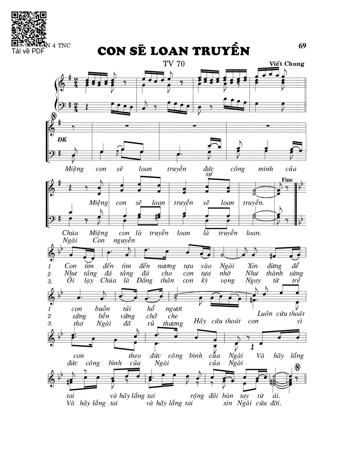 Sheet music Con sẽ loan truyền (Thánh Vịnh 70) by Viết Chung and PDF file was posted here to support you to practice singing perfectly. Sheets with notes and chords are for reference only, for non-commercial purposes only, not involved with earning money by buying and selling. Copyright is belong to song writer/author and copyright owner. Truongca.com do not own any copyrighted content. You can download the high-quality PDF files which contain staffs by PDF link above.