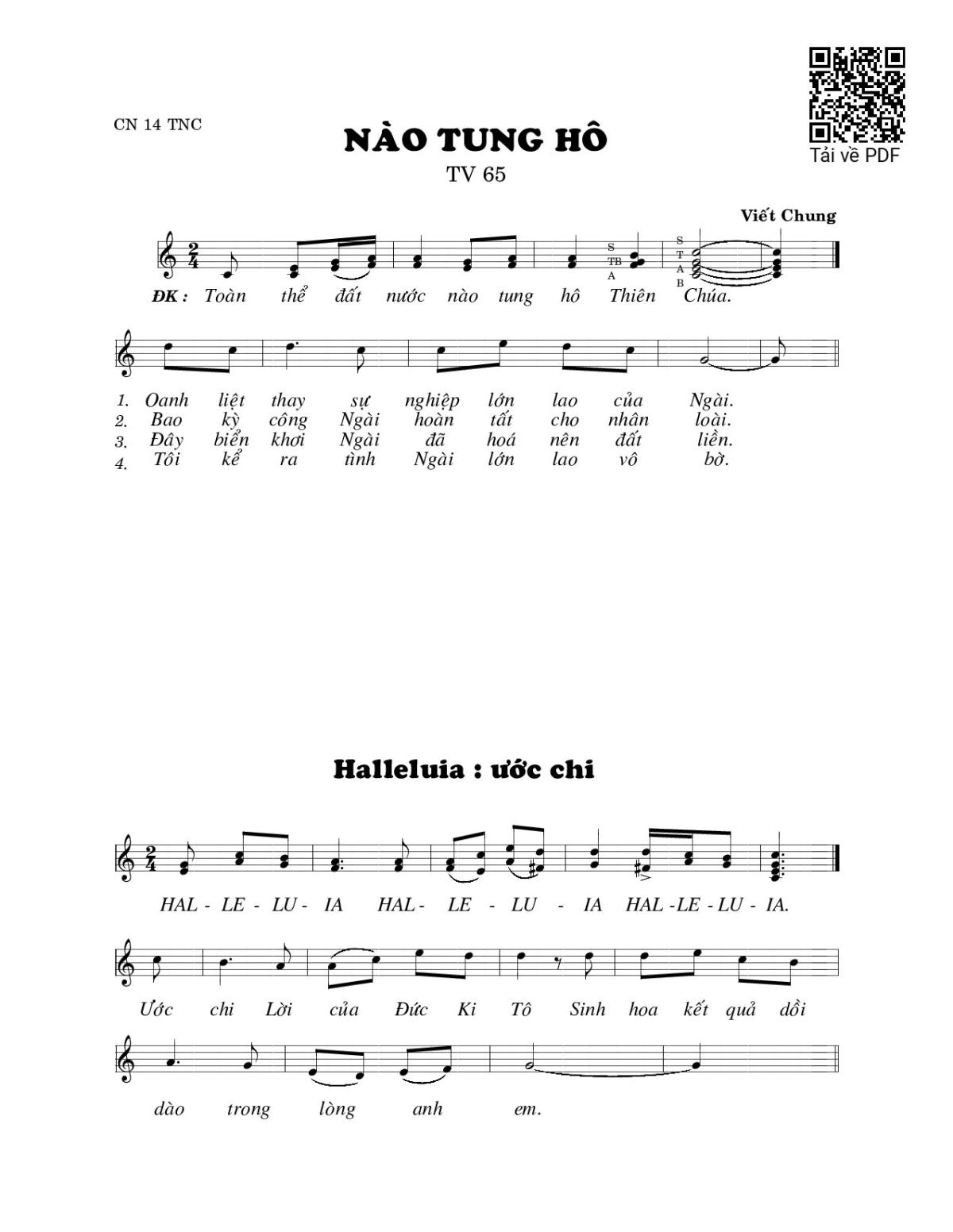 Sheet music Nào tung hô (Thánh Vịnh 65) by Viết Chung and PDF file was posted here to support you to practice singing perfectly. Sheets with notes and chords are for reference only, for non-commercial purposes only, not involved with earning money by buying and selling. Copyright is belong to song writer/author and copyright owner. Truongca.com do not own any copyrighted content. You can download the high-quality PDF files which contain staffs by PDF link above.