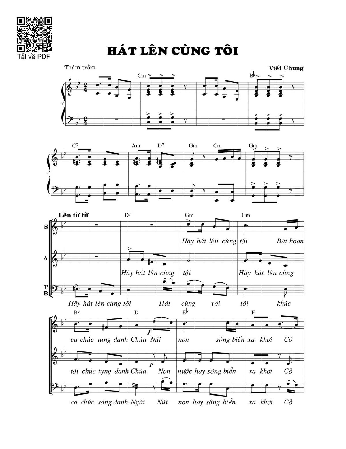 Sheet music Hát lên cùng tôi by Viết Chung and PDF file was posted here to support you to practice singing perfectly. Sheets with notes and chords are for reference only, for non-commercial purposes only, not involved with earning money by buying and selling. Copyright is belong to song writer/author and copyright owner. Truongca.com do not own any copyrighted content. You can download the high-quality PDF files which contain staffs by PDF link above.