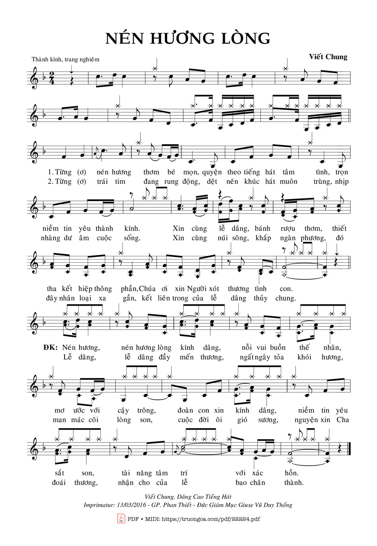 1) Từng (ơ) nén hương thơm bé mọn, quyện theo tiếng hát tâm tình, trọn niềm tin yêu thành kính. Xin cùng lễ dâng, bánh rượu thơm, thiết tha kết hiệp thông phần, Chúa ơi xin Người xót thương tình con.