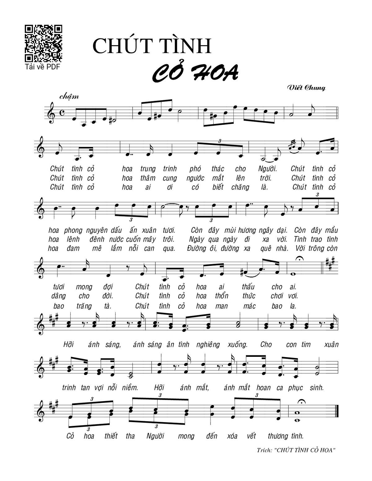 Sheet music Chút tình cỏ hoa by Viết Chung and PDF file was posted here to support you to practice singing perfectly. Sheets with notes and chords are for reference only, for non-commercial purposes only, not involved with earning money by buying and selling. Copyright is belong to song writer/author and copyright owner. Truongca.com do not own any copyrighted content. You can download the high-quality PDF files which contain staffs by PDF link above.