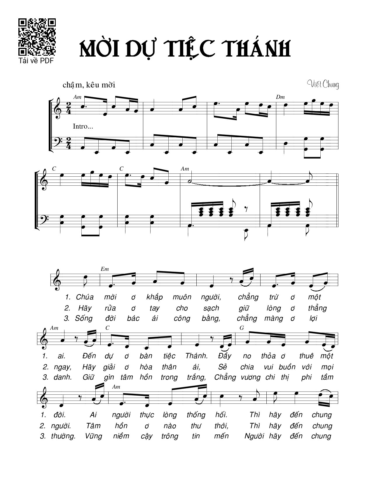Sheet music Mời dự tiệc thánh by Viết Chung and PDF file was posted here to support you to practice singing perfectly. Sheets with notes and chords are for reference only, for non-commercial purposes only, not involved with earning money by buying and selling. Copyright is belong to song writer/author and copyright owner. Truongca.com do not own any copyrighted content. You can download the high-quality PDF files which contain staffs by PDF link above.