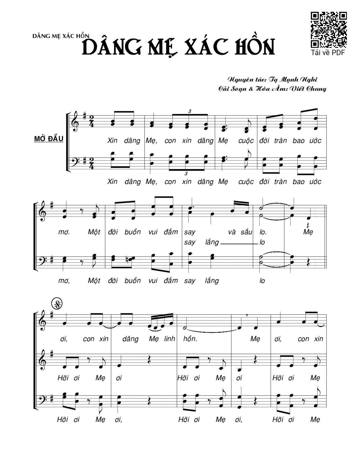 Sheet music Dâng Mẹ xác hồn by Viết Chung and PDF file was posted here to support you to practice singing perfectly. Sheets with notes and chords are for reference only, for non-commercial purposes only, not involved with earning money by buying and selling. Copyright is belong to song writer/author and copyright owner. Truongca.com do not own any copyrighted content. You can download the high-quality PDF files which contain staffs by PDF link above.