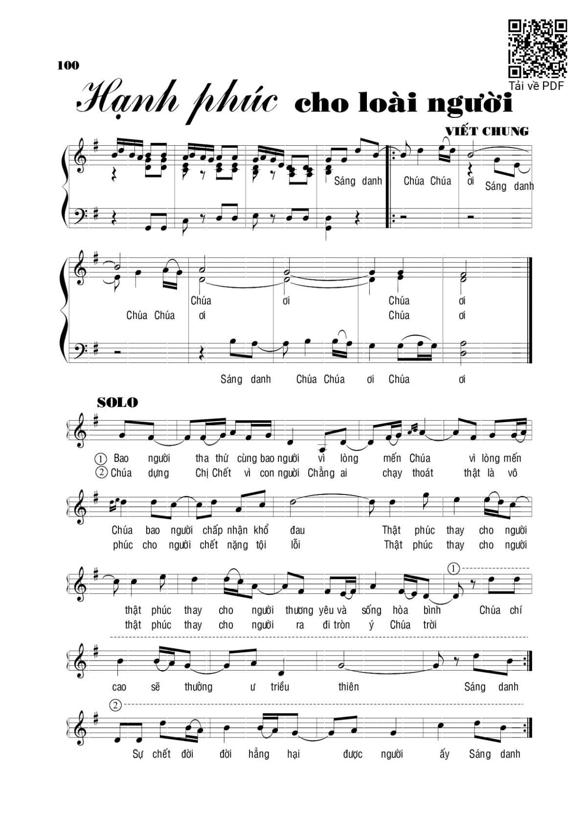 Sheet music Hạnh phúc cho loài người by Viết Chung and PDF file was posted here to support you to practice singing perfectly. Sheets with notes and chords are for reference only, for non-commercial purposes only, not involved with earning money by buying and selling. Copyright is belong to song writer/author and copyright owner. Truongca.com do not own any copyrighted content. You can download the high-quality PDF files which contain staffs by PDF link above.