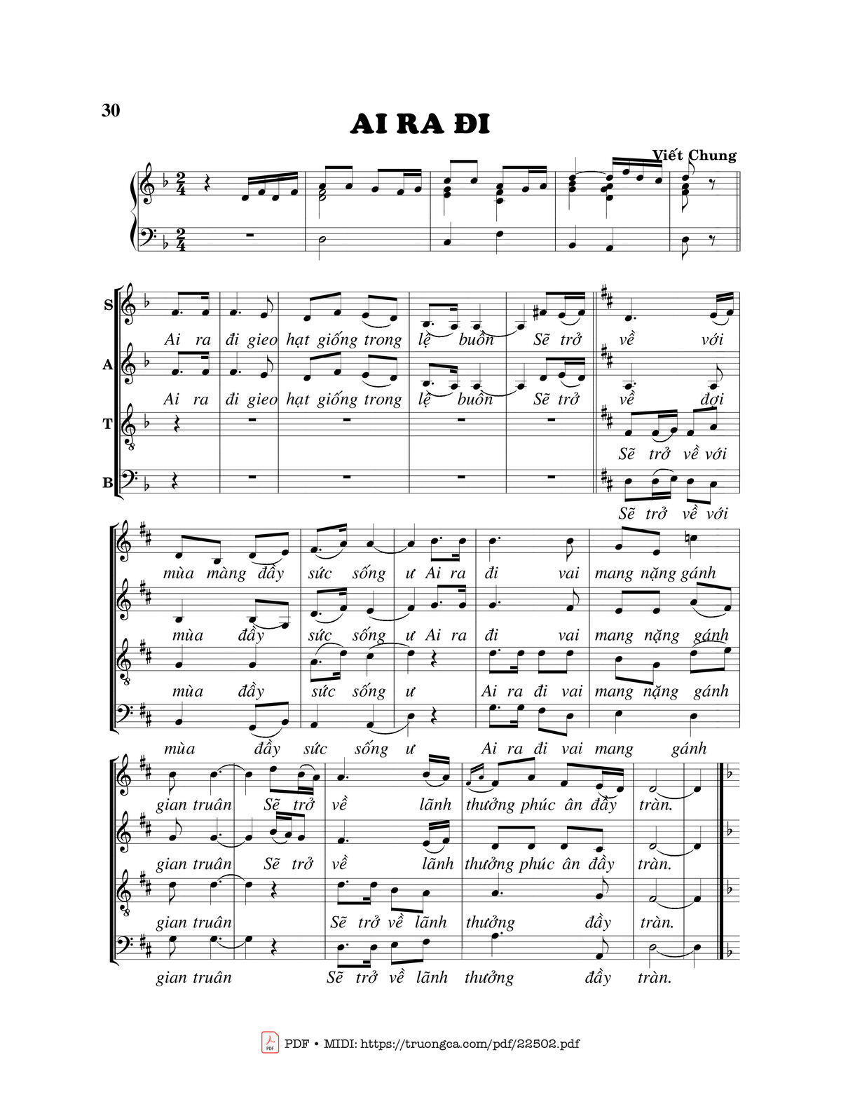 Điệp khúc. Ai ra đi gieo hạt giống trong lệ buồn, sẽ trở về với mùa màng đầy sức sống. Ai ra đi mang nặng gánh gian truân, sẽ trở về lãnh thưởng phúc ân đầy tràn.