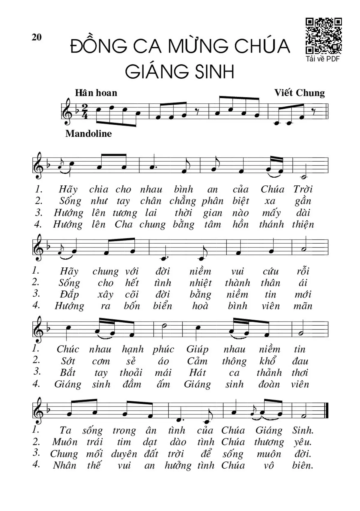 Sheet music Đồng ca mừng Chúa Giáng Sinh by Viết Chung and PDF file was posted here to support you to practice singing perfectly. Sheets with notes and chords are for reference only, for non-commercial purposes only, not involved with earning money by buying and selling. Copyright is belong to song writer/author and copyright owner. Truongca.com do not own any copyrighted content. You can download the high-quality PDF files which contain staffs by PDF link above.