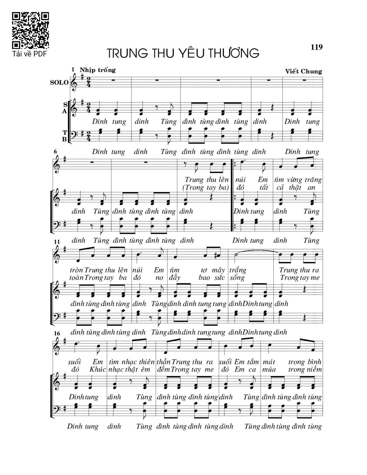 Sheet music Trung thu yêu thương by Viết Chung and PDF file was posted here to support you to practice singing perfectly. Sheets with notes and chords are for reference only, for non-commercial purposes only, not involved with earning money by buying and selling. Copyright is belong to song writer/author and copyright owner. Truongca.com do not own any copyrighted content. You can download the high-quality PDF files which contain staffs by PDF link above.