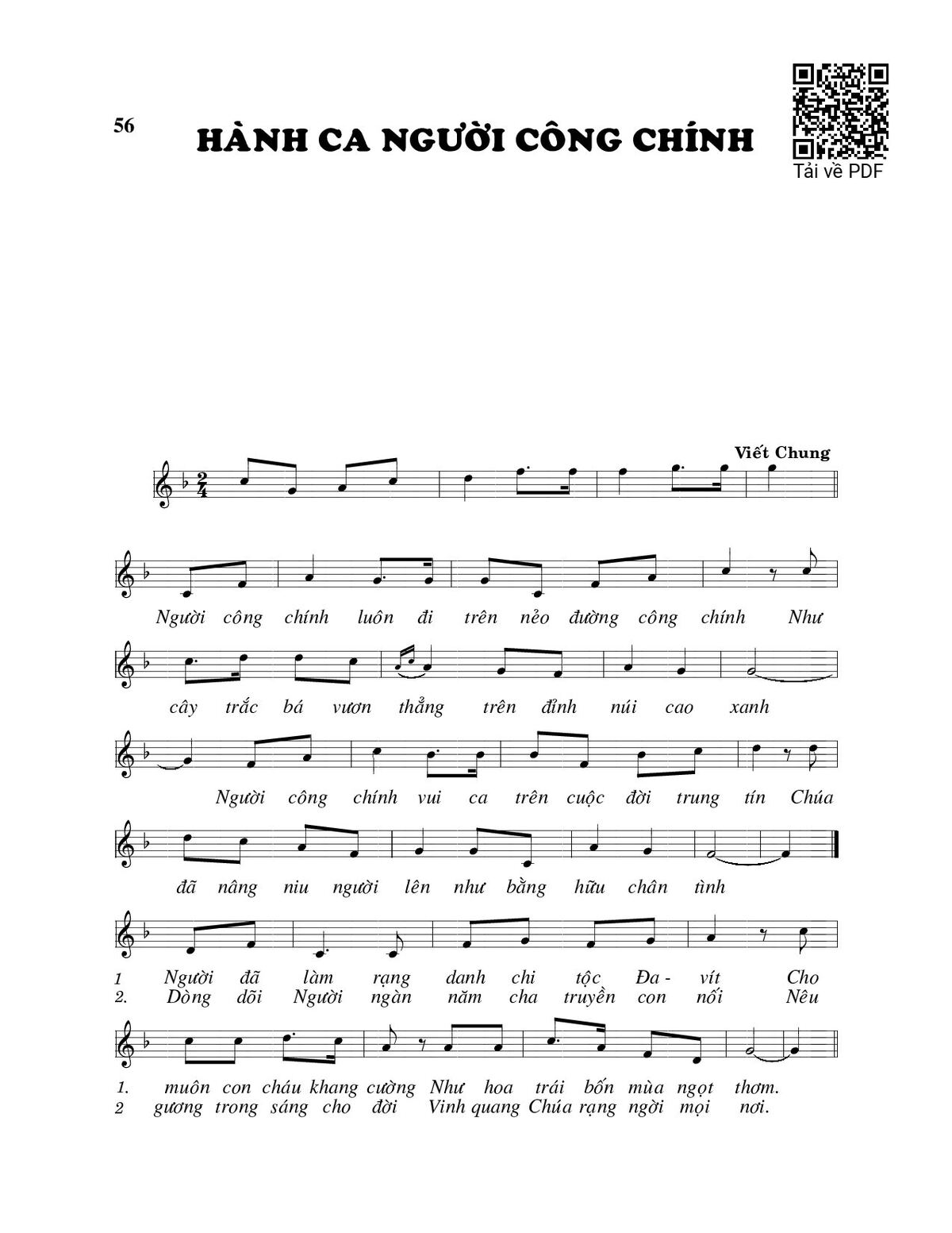 Sheet music Hành ca người công chính by Viết Chung and PDF file was posted here to support you to practice singing perfectly. Sheets with notes and chords are for reference only, for non-commercial purposes only, not involved with earning money by buying and selling. Copyright is belong to song writer/author and copyright owner. Truongca.com do not own any copyrighted content. You can download the high-quality PDF files which contain staffs by PDF link above.