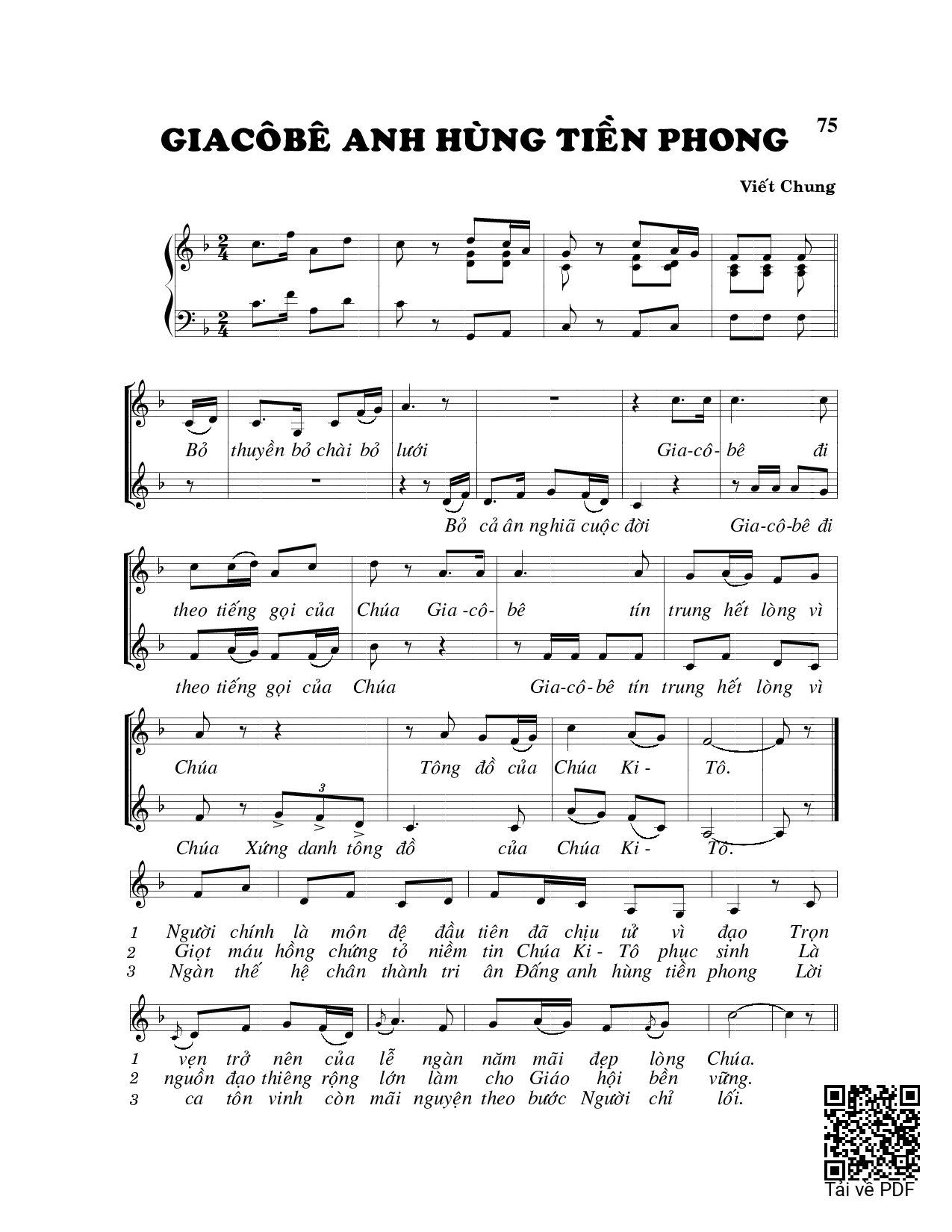 Sheet music Giacobe anh hùng tiên phong by Viết Chung and PDF file was posted here to support you to practice singing perfectly. Sheets with notes and chords are for reference only, for non-commercial purposes only, not involved with earning money by buying and selling. Copyright is belong to song writer/author and copyright owner. Truongca.com do not own any copyrighted content. You can download the high-quality PDF files which contain staffs by PDF link above.
