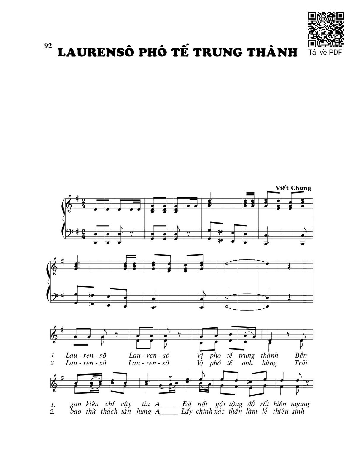 Sheet music Laurenso phó tế trung thành by Viết Chung and PDF file was posted here to support you to practice singing perfectly. Sheets with notes and chords are for reference only, for non-commercial purposes only, not involved with earning money by buying and selling. Copyright is belong to song writer/author and copyright owner. Truongca.com do not own any copyrighted content. You can download the high-quality PDF files which contain staffs by PDF link above.