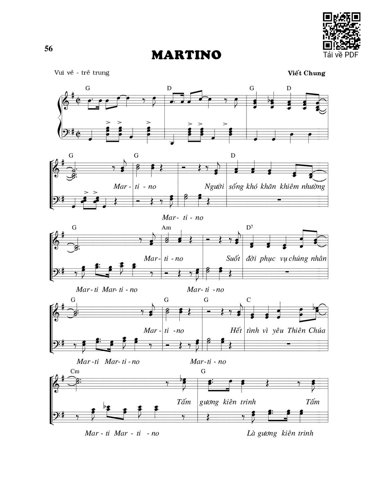 Sheet music Martino by Viết Chung and PDF file was posted here to support you to practice singing perfectly. Sheets with notes and chords are for reference only, for non-commercial purposes only, not involved with earning money by buying and selling. Copyright is belong to song writer/author and copyright owner. Truongca.com do not own any copyrighted content. You can download the high-quality PDF files which contain staffs by PDF link above.