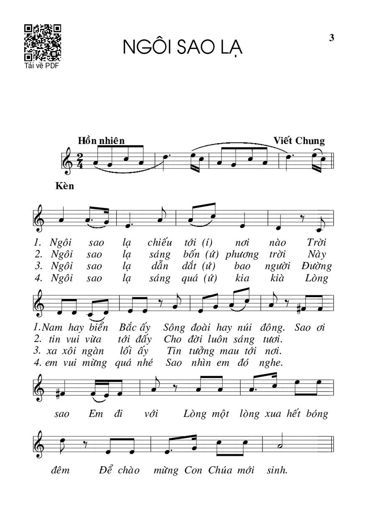 Sheet music Ngôi sao lạ by Viết Chung and PDF file was posted here to support you to practice singing perfectly. Sheets with notes and chords are for reference only, for non-commercial purposes only, not involved with earning money by buying and selling. Copyright is belong to song writer/author and copyright owner. Truongca.com do not own any copyrighted content. You can download the high-quality PDF files which contain staffs by PDF link above.