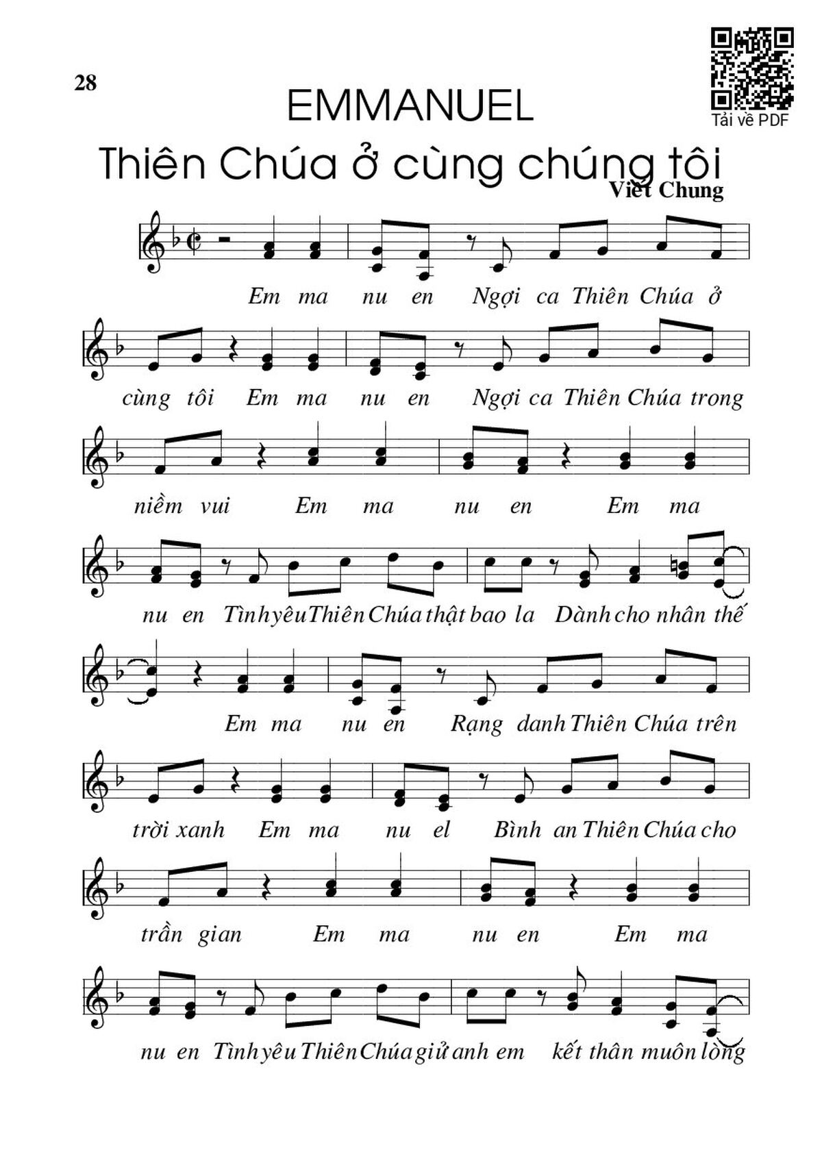 Sheet music Emmanuel by Viết Chung and PDF file was posted here to support you to practice singing perfectly. Sheets with notes and chords are for reference only, for non-commercial purposes only, not involved with earning money by buying and selling. Copyright is belong to song writer/author and copyright owner. Truongca.com do not own any copyrighted content. You can download the high-quality PDF files which contain staffs by PDF link above.