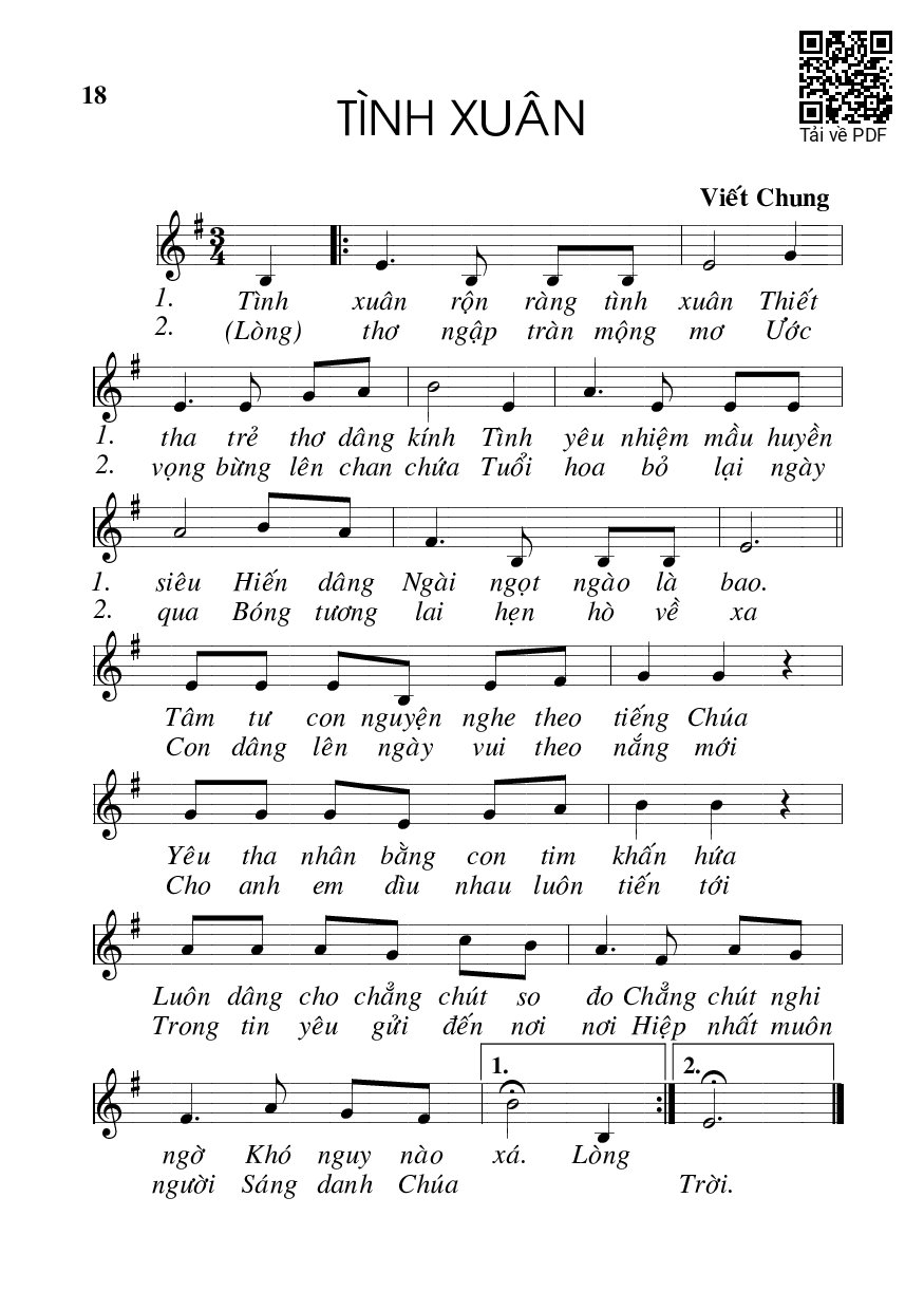 Sheet music Tình xuân by Viết Chung and PDF file was posted here to support you to practice singing perfectly. Sheets with notes and chords are for reference only, for non-commercial purposes only, not involved with earning money by buying and selling. Copyright is belong to song writer/author and copyright owner. Truongca.com do not own any copyrighted content. You can download the high-quality PDF files which contain staffs by PDF link above.