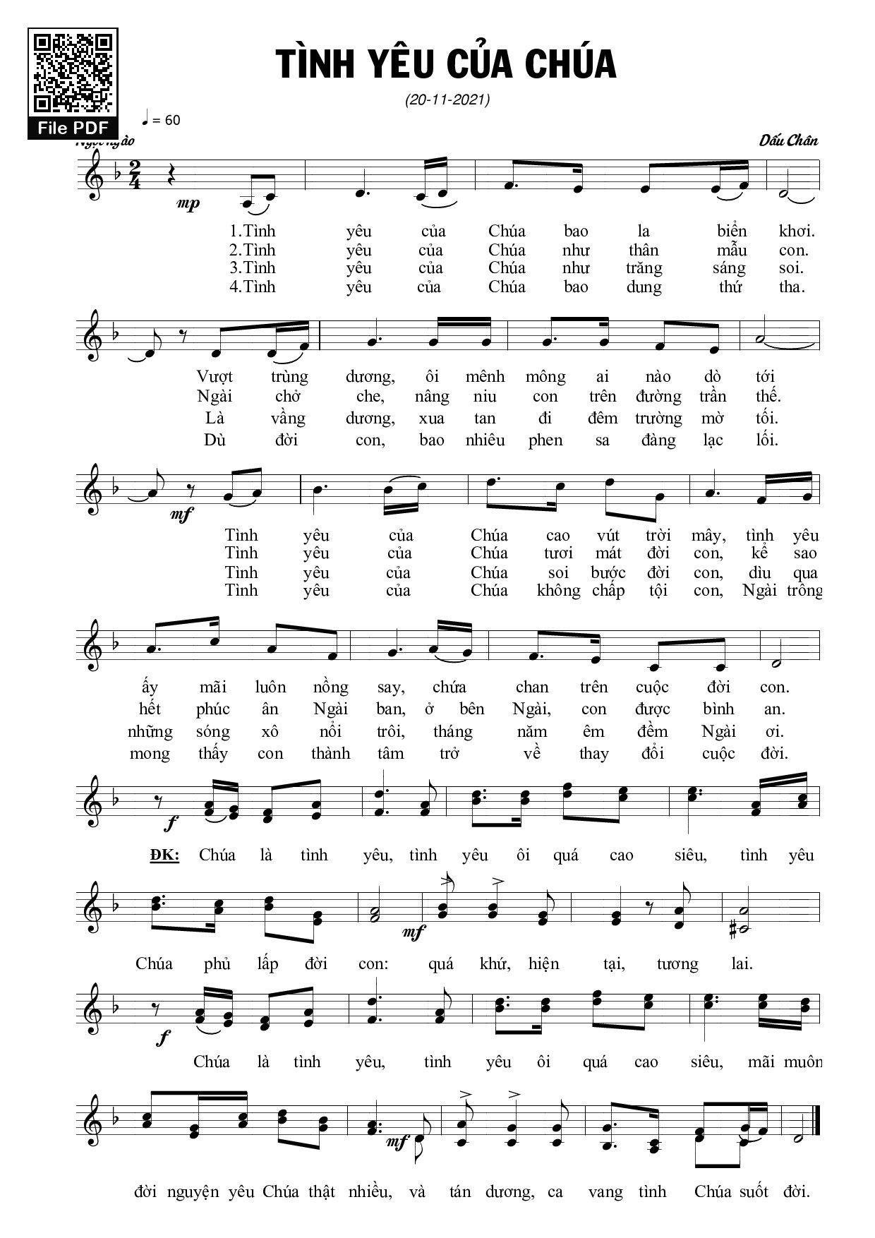 Sheet music Tình yêu của Chúa by Dấu Chân and PDF file was posted here to support you to practice singing perfectly. Sheets with notes and chords are for reference only, for non-commercial purposes only, not involved with earning money by buying and selling. Copyright is belong to song writer/author and copyright owner. Truongca.com do not own any copyrighted content. You can download the high-quality PDF files which contain staffs by PDF link above.