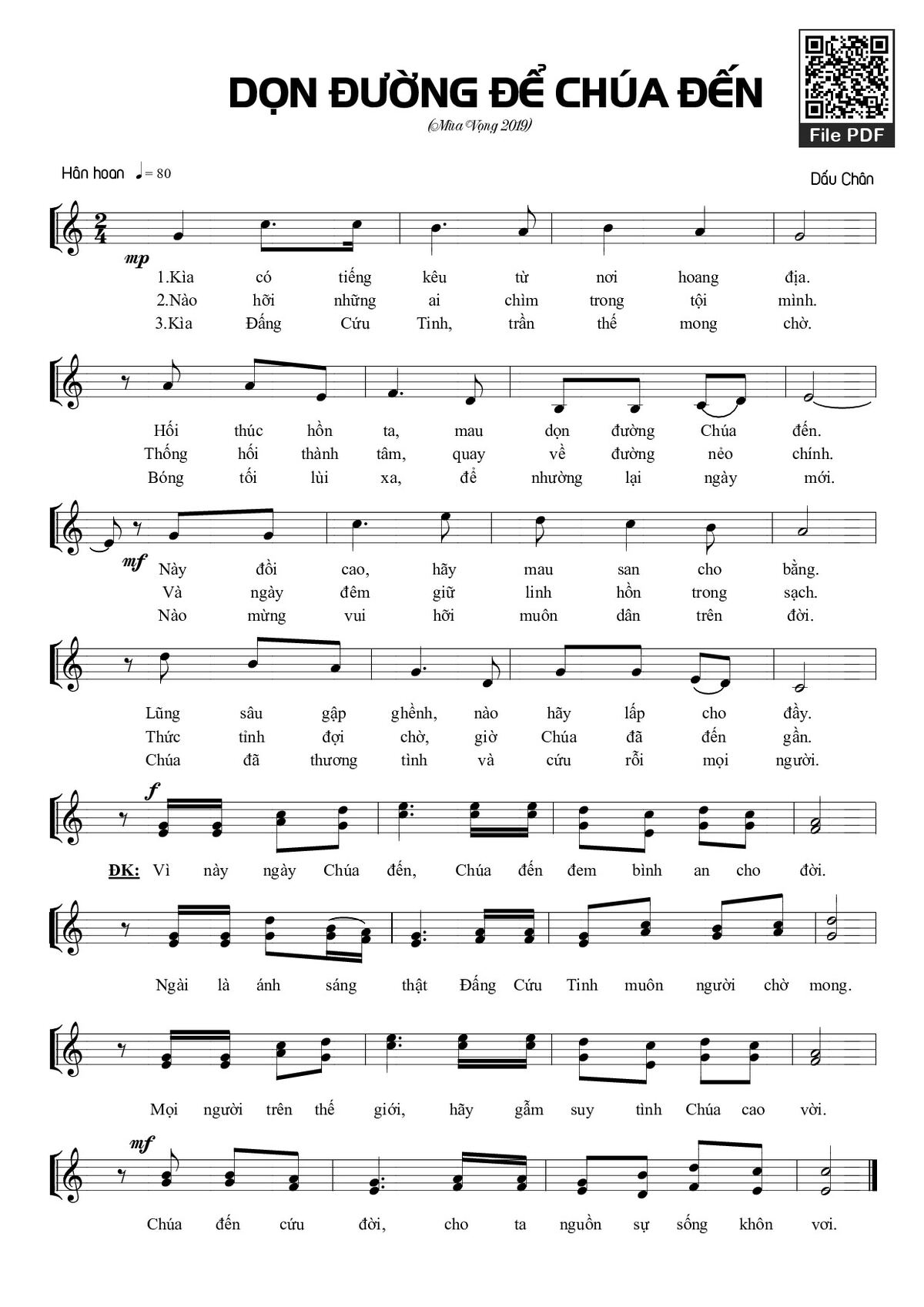 Sheet music Dọn đường để Chúa đến by Dấu Chân and PDF file was posted here to support you to practice singing perfectly. Sheets with notes and chords are for reference only, for non-commercial purposes only, not involved with earning money by buying and selling. Copyright is belong to song writer/author and copyright owner. Truongca.com do not own any copyrighted content. You can download the high-quality PDF files which contain staffs by PDF link above.