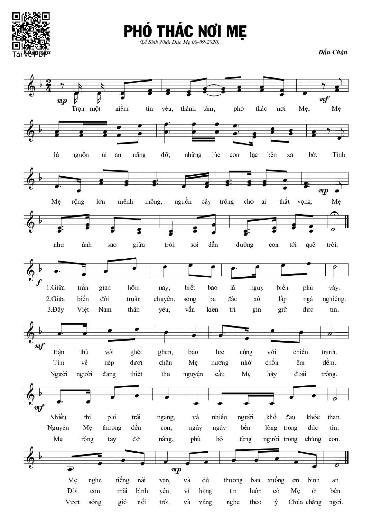 Transposition is the process of moving a song's melody and chords up or down in pitch by a constant interval. The direction of the transposition tool is indicated by a plus (+) sign for up and a minus (-) sign for down. Hover mouse over chords signs to see the chords chart of Phó thác nơi Mẹ song.