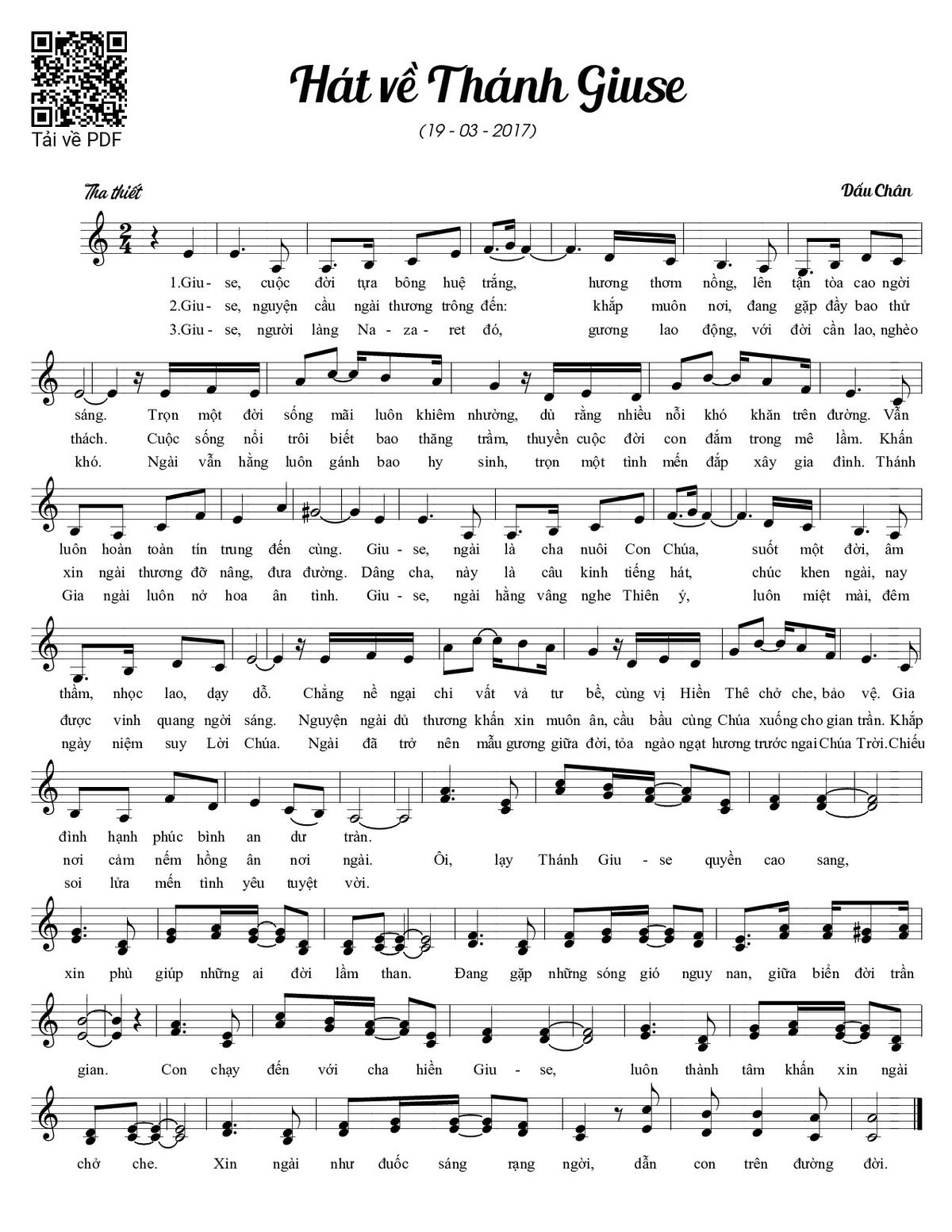 Sheet music Hát về Thánh Giuse by Dấu Chân and PDF file was posted here to support you to practice singing perfectly. Sheets with notes and chords are for reference only, for non-commercial purposes only, not involved with earning money by buying and selling. Copyright is belong to song writer/author and copyright owner. Truongca.com do not own any copyrighted content. You can download the high-quality PDF files which contain staffs by PDF link above.