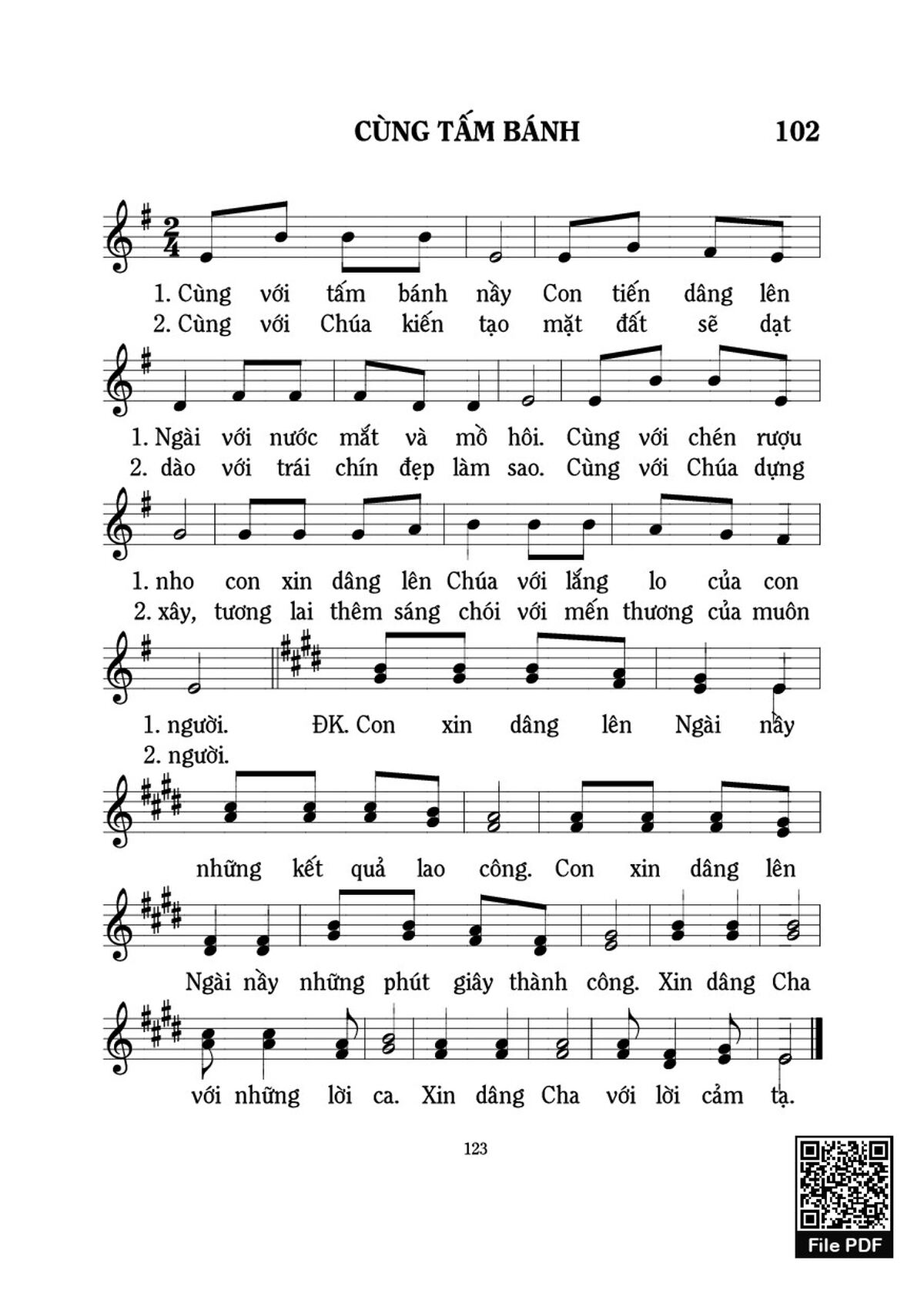 1- Cùng với tấm bánh này con tiến dâng lên Ngài với nước mắt và mồ hôi. Cùng với chén rượu nho con xin dâng lên Chúa với lắng lo của con người.