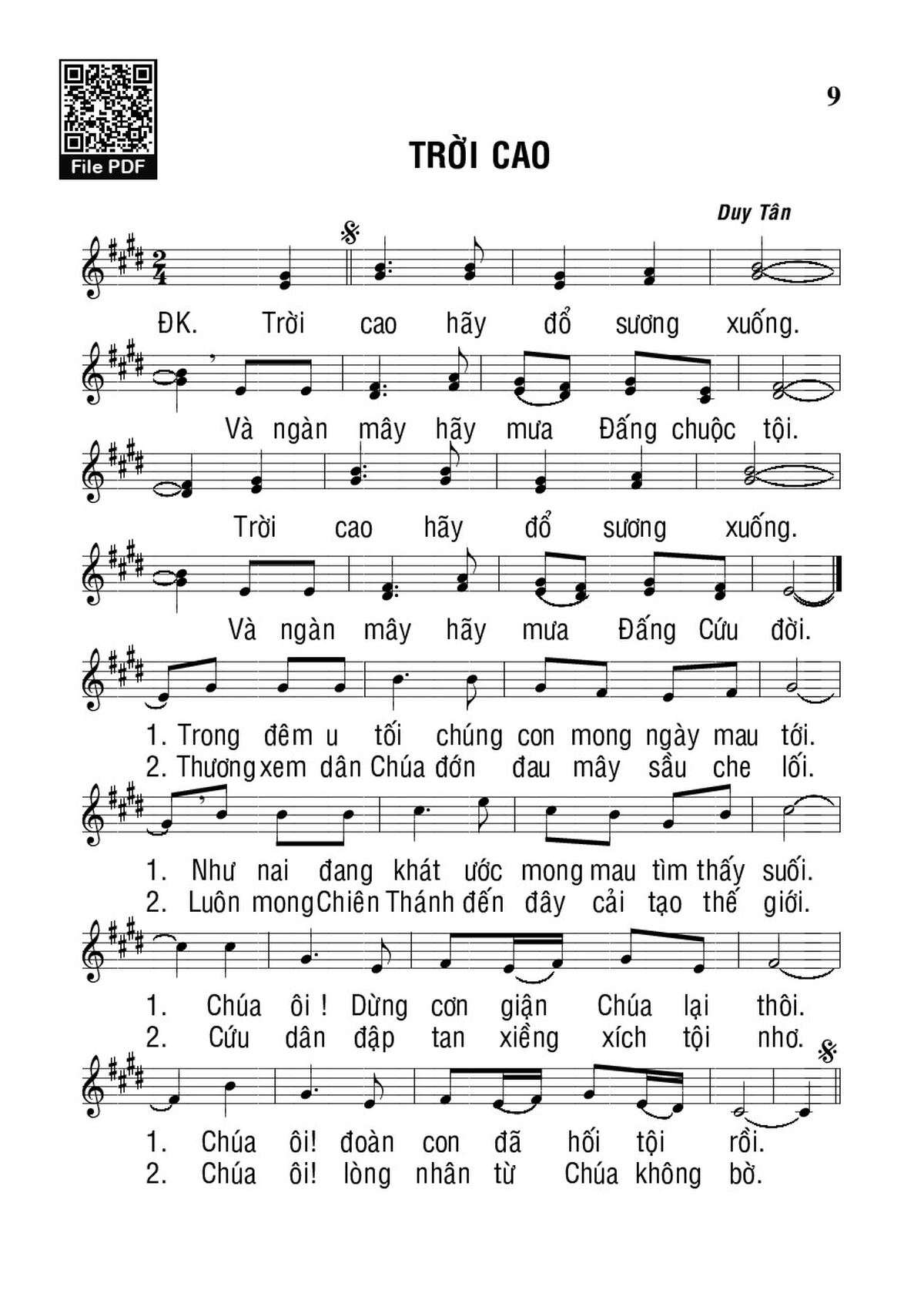 Điệp khúc. Trời cao hãy đổ sương xuống. và ngàn mây hãy mưa Đấng Chuộc Tội. Trời cao hãy đổ sương xuống và ngàn mây hãy mưa Đấng Cứu Đời.
