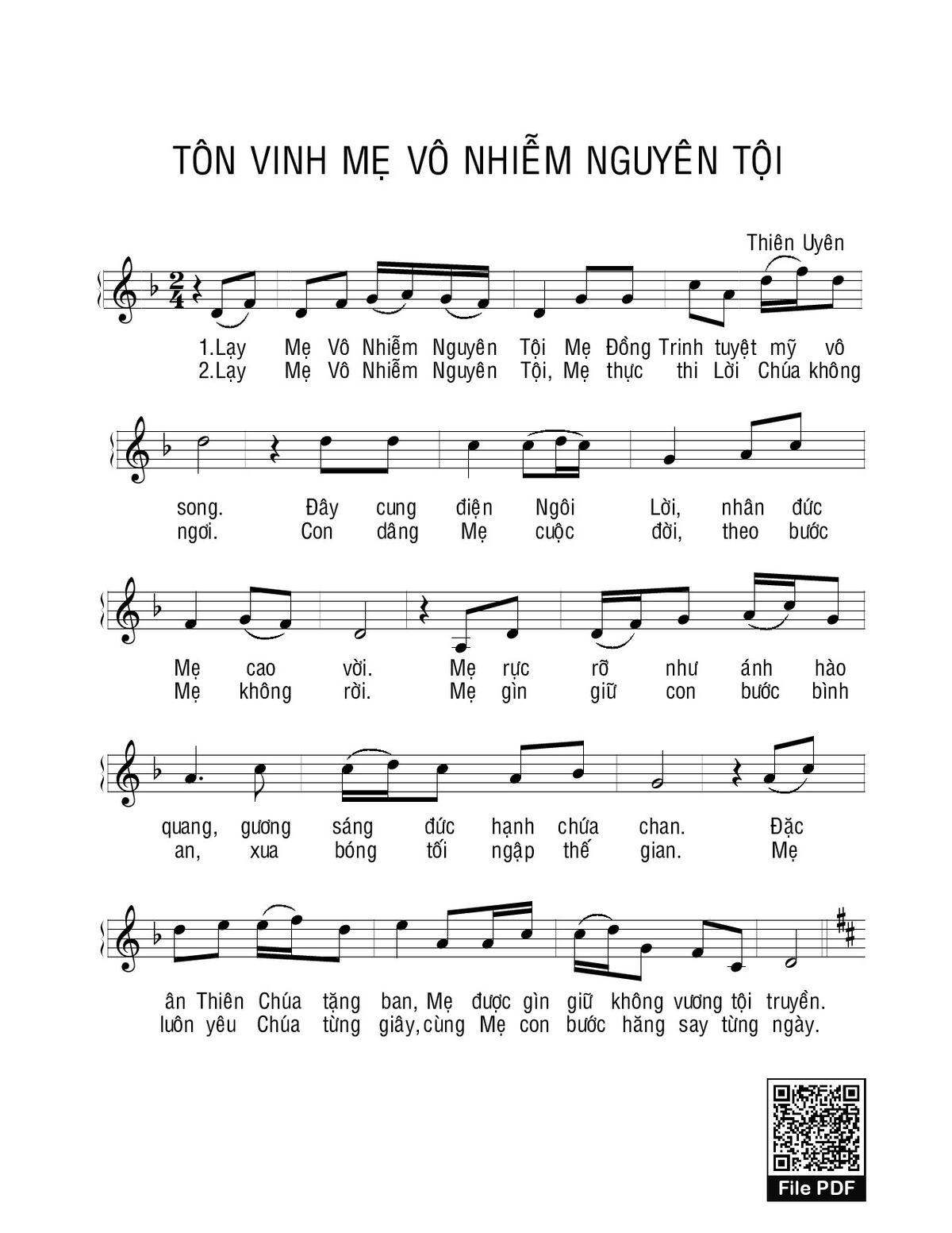 1. Lạy Mẹ Vô Nhiễm Nguyên Tội Mẹ đồng trinh tuyệt mỹ vô song. Đây cung điện Ngôi Lời, nhân đức Mẹ cao vời. Mẹ rực rỡ như ánh hào quang, gương sáng đức hạnh chứa chan. Đặc ân Thiên Chúa tặng ban, Mẹ được gìn giữ không vương tội truyền.