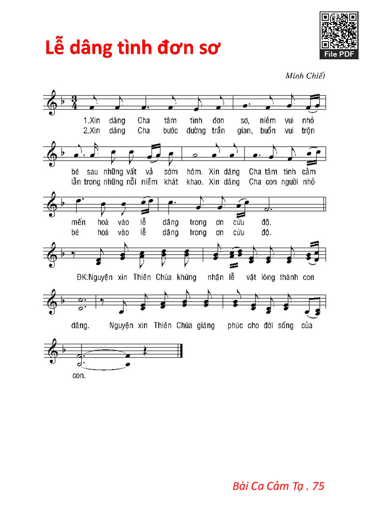 1. Xin dâng Cha tâm tình đơn sơ, niềm vui nhỏ bé sau những vất vả sớm hôm. Xin dâng Cha tâm tình cảm mến hòa vào lễ dâng trong ơn cứu độ.