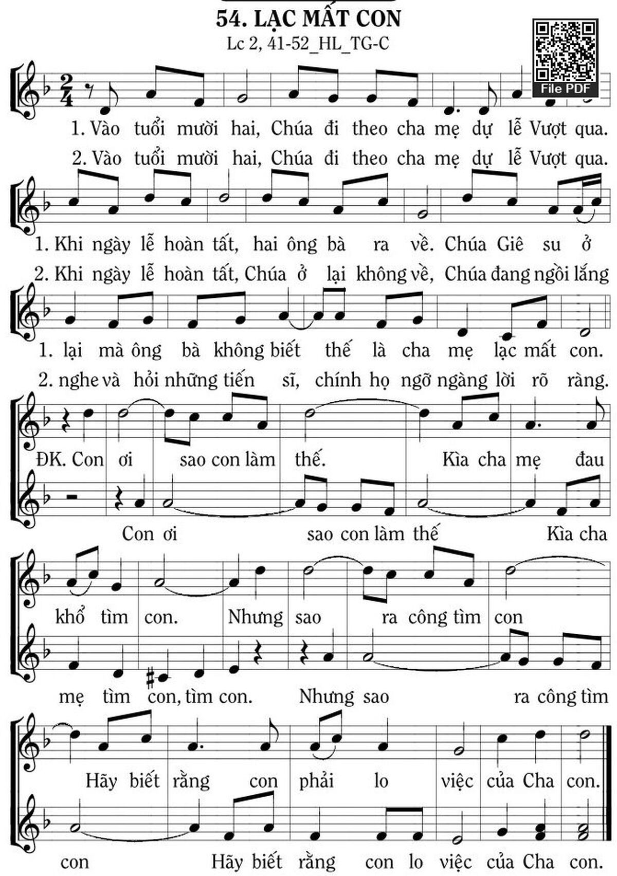 Điệp khúc. Con ơi sao con làm thế. Kìa cha mẹ đau khổ tìm con. Nhưng sao ra công tìm con. Hãy biết rằng con phải lo việc của Cha con.
