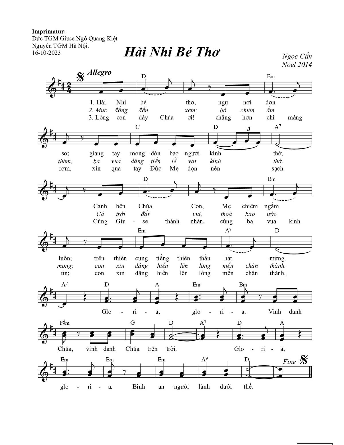 1- Hài Nhi bé thơ, ngự nơi đơn sơ, giang tay mong đón bao người kính thờ. Cạnh bên Chúa Con, Mẹ chiêm ngắm luôn, trên thiên cung tiếng thiên thần hát mừng.