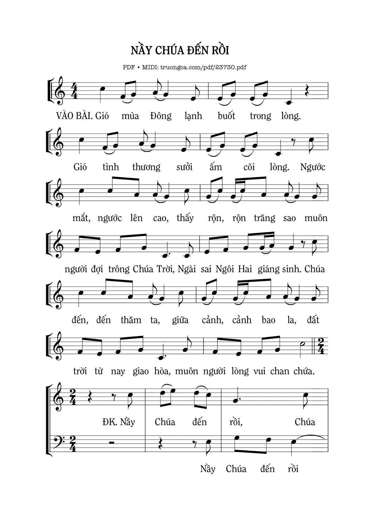 Điệp khúc. Nầy Chúa đến rồi, Chúa đến rồi, đến vì yêu ta, tấm lòng bao la. Tình í a rạng ngời là tình í a tuyệt vời. Ôi tình yêu lên ngôi. Đây Chúa đến rồi, Chúa đến rồi: Hòa bình nơi nơi, niềm vui phơi phới.