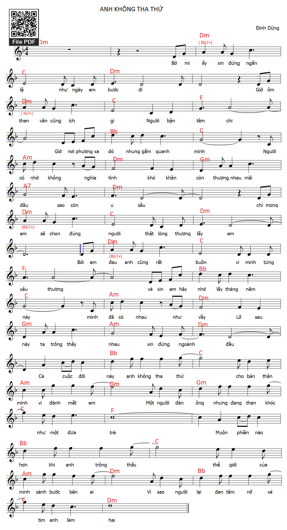 Transposition is the process of moving a song's melody and chords up or down in pitch by a constant interval. The direction of the transposition tool is indicated by a plus (+) sign for up and a minus (-) sign for down. Hover mouse over chords signs to see the chords chart of Anh không tha thứ song.