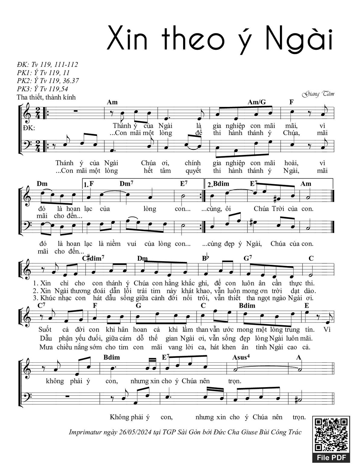 1. Xin chỉ cho con thánh ý Chúa con hằng khắc ghi, để con luôn ân cần thực thi. Suốt cả đời con khi hân hoan cả khi lầm than vẫn ước mong một lòng trung tín. Vì không phải ý con, nhưng xin cho ý Chúa nên trọn.