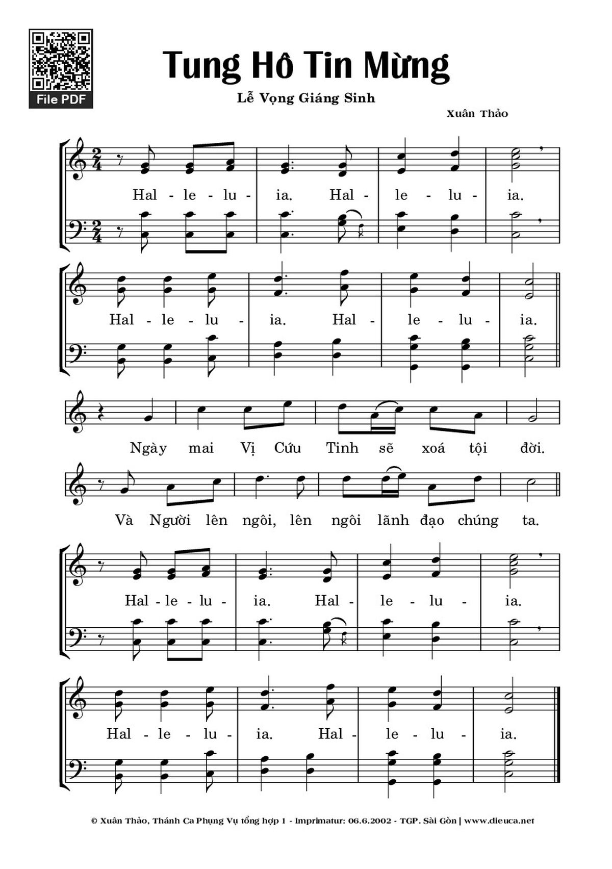 Hal-le-lu-ia. Hal-le- lu-ia. Hal-le-lu-ia. Hal-le-lu-ia. Ngày mai Vị Cứu Tinh sẽ xoá tội đời. Và Người lên ngôi, lên ngôi lãnh đạo chúng ta. Hal-le-lu-ia. Hal–le- lu-ia. Hal-le-lu-ia. Hal-le-lu-ia.