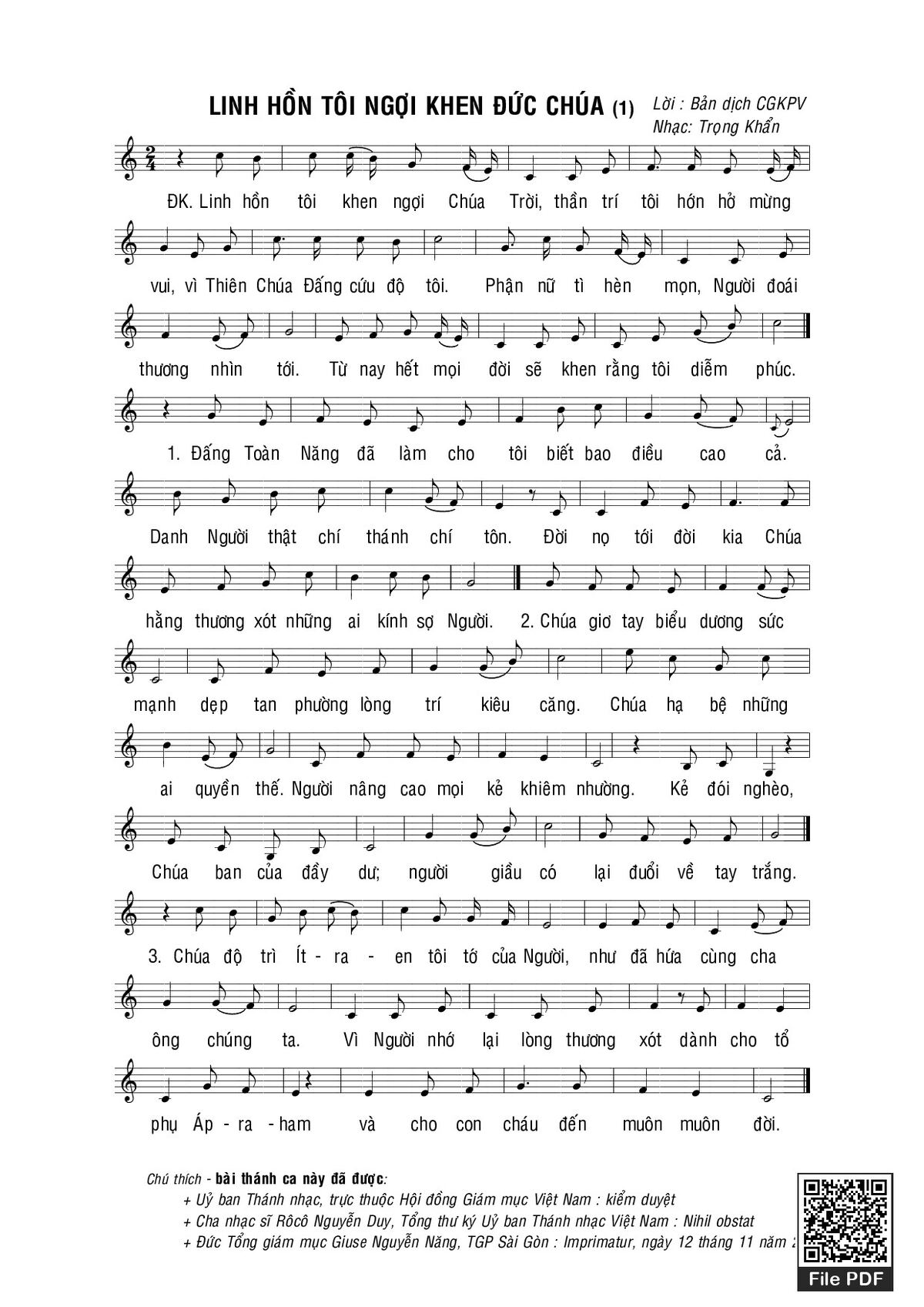 Điệp khúc. Linh hồn tôi ngợi khen Chúa Trời, thần trí tôi hớn hở mừng vui. Vì Thiên Chúa Đấng cứu độ tôi. Phận nữ tỳ hèn mọn người đoái thương nhìn tới. Từ nay hết mọi đời sẽ khen rằng tôi diễm phúc.