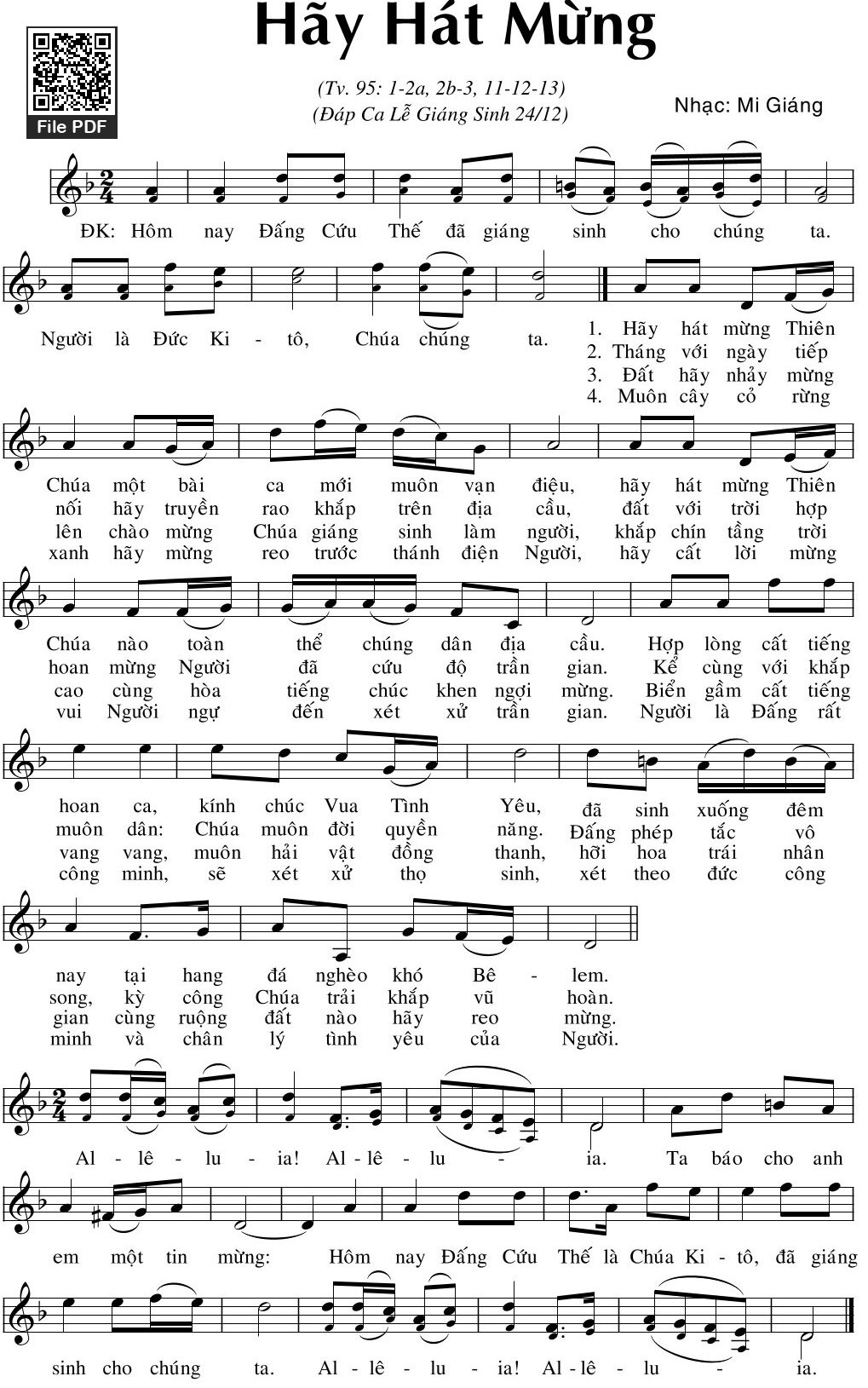 4. Muôn cây cỏ rừng xanh hãy mừng reo trước thánh điện Người, hãy cất lời mừng vui Người ngự đến xét xử trần gian. Người là Đấng rất công minh, sẽ xét xử thọ sinh, xét theo đức công minh và chân lý tình yêu của Người. Al-lê-lu-ia! Al-lê-lu-ia. Al-lê-lu-ia! Al-lê-lu-ia.