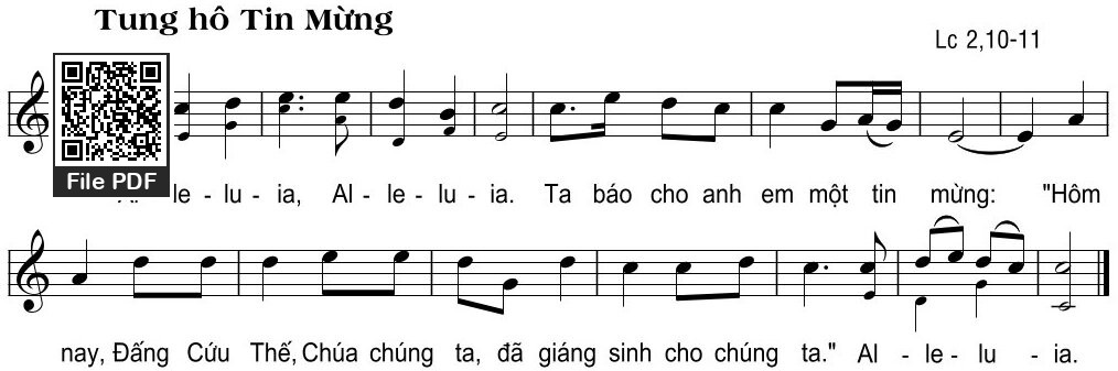 Alleluia, Alleluia. Ta báo cho anh em một tin mừng: “Hôm nay, Đấng Cứu Thế, Chúa chúng ta, đã giáng sinh cho chúng ta.” Alleiluia.