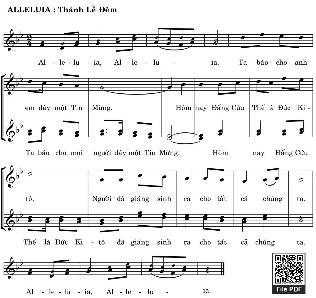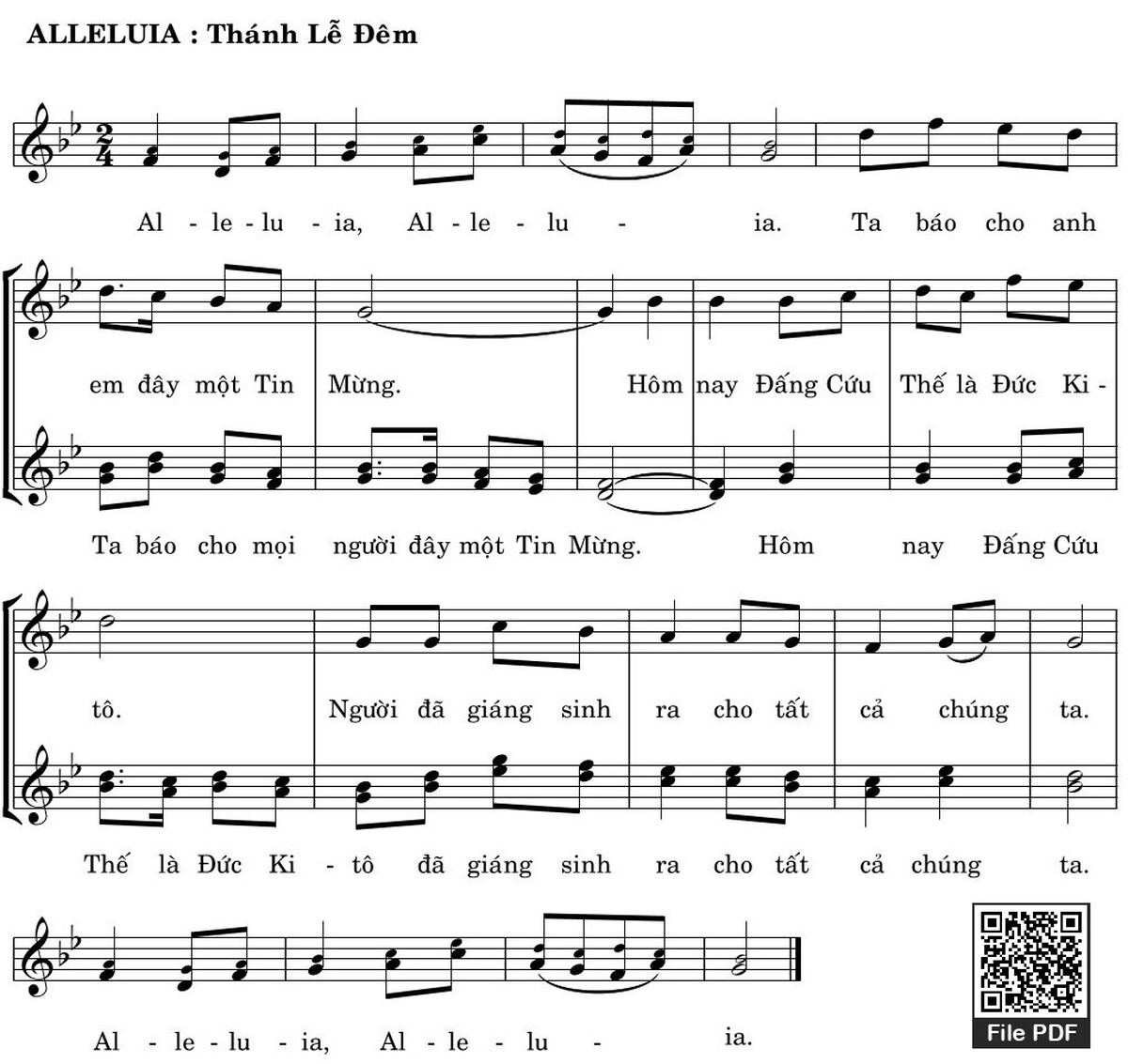 Alleluia, Alleluia. Ta báo cho anh em đây một Tin Mừng. Hôm nay Đấng Cứu Thế là Đức Ki-tô. Người đã giáng sinh ra cho tất cả chúng ta. Alleluia, Alleluia.