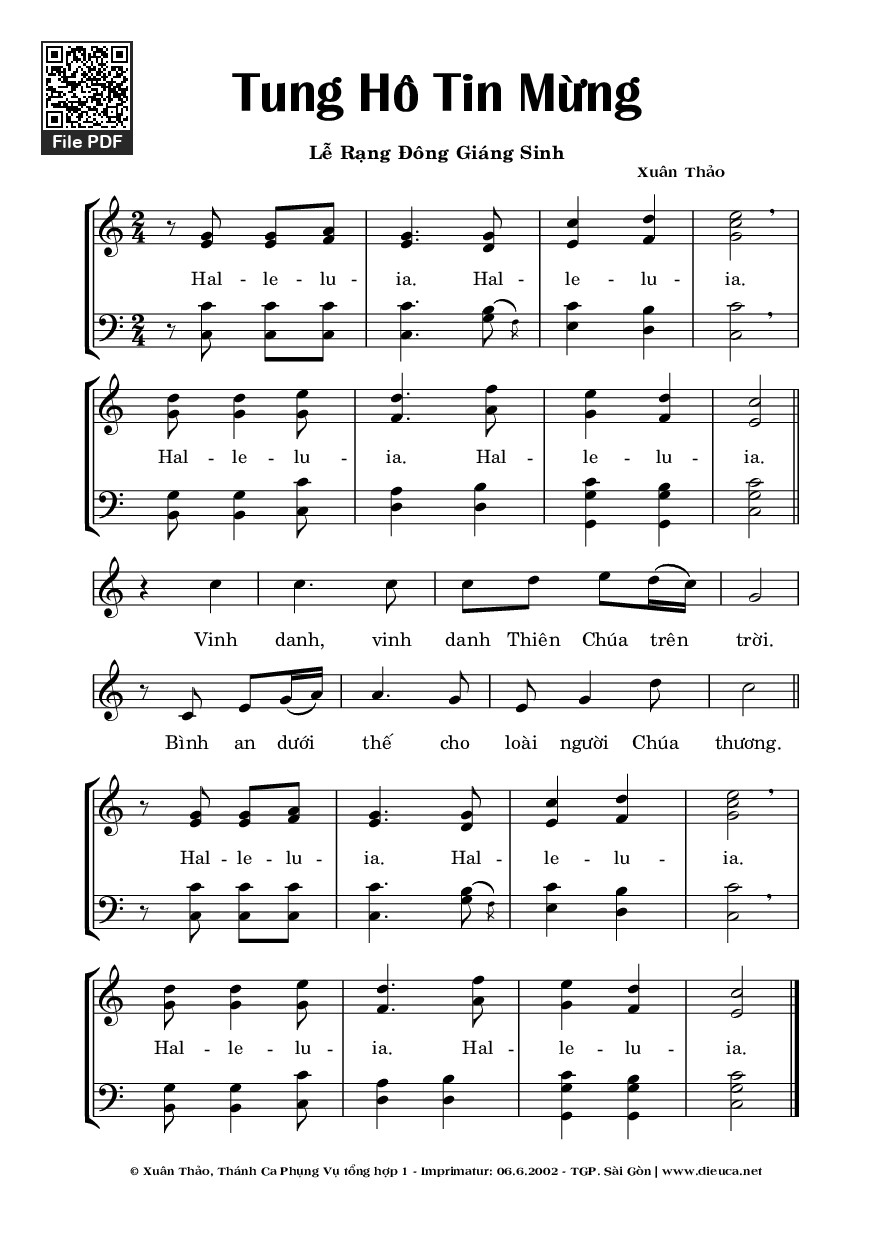 Hal-le-lu-ia. Hal-le-lu-ia. Hal-le-lu-ia. Hal-le-lu-ia. Vinh danh, vinh danh Thiên Chúa trên trời. Bình an dưới thế cho loài người Chúa thương. Hal-le-lu-ia. Hal-le-lu-ia. Hal-le-lu-ia. Hal-le-lu-ia.