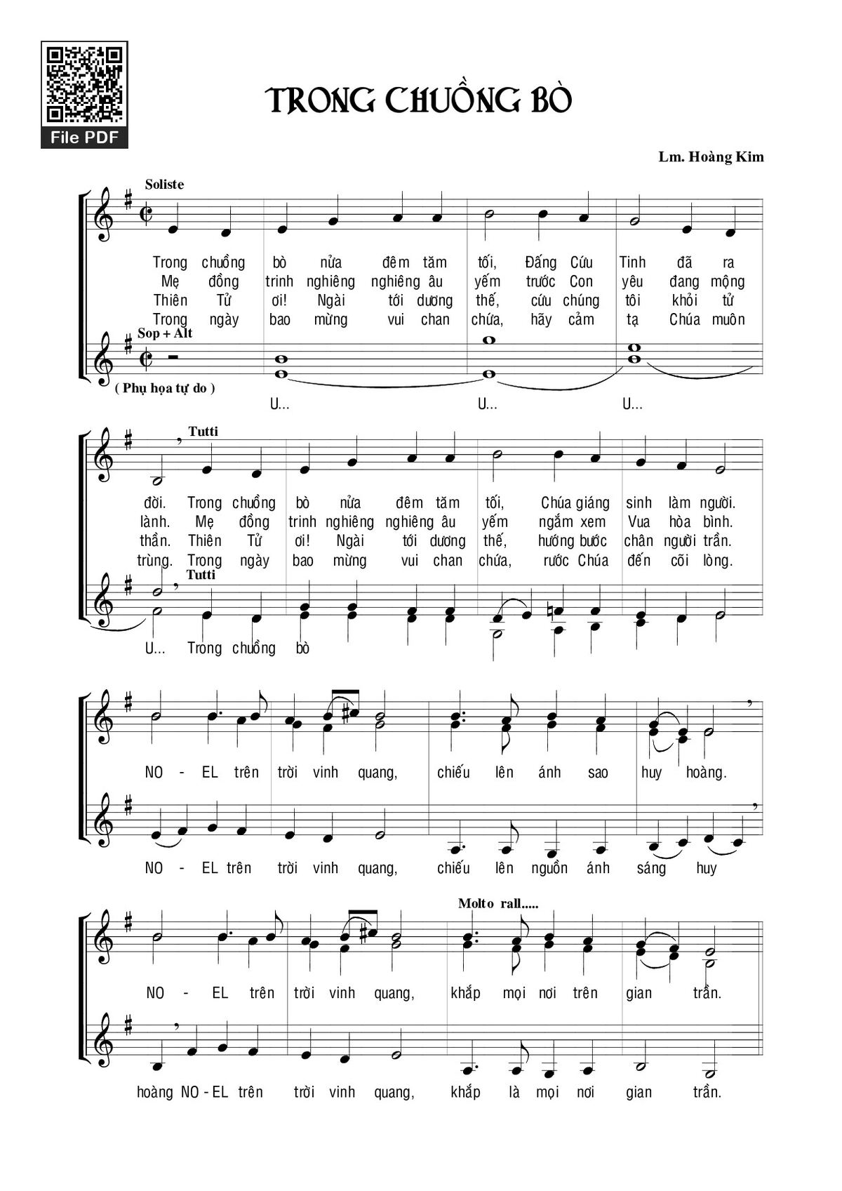 1. Trong chuồng bò nửa đêm tăm tối Đấng cứu tinh đã ra đời. Trong chuồng bò nửa đêm tăm tối Chúa giáng sinh làm Người. No-el trên trời vinh quang chiếu lên ánh sao huy hoàng. No-el trên trời vinh quang khắp mọi nơi trên gian trần
