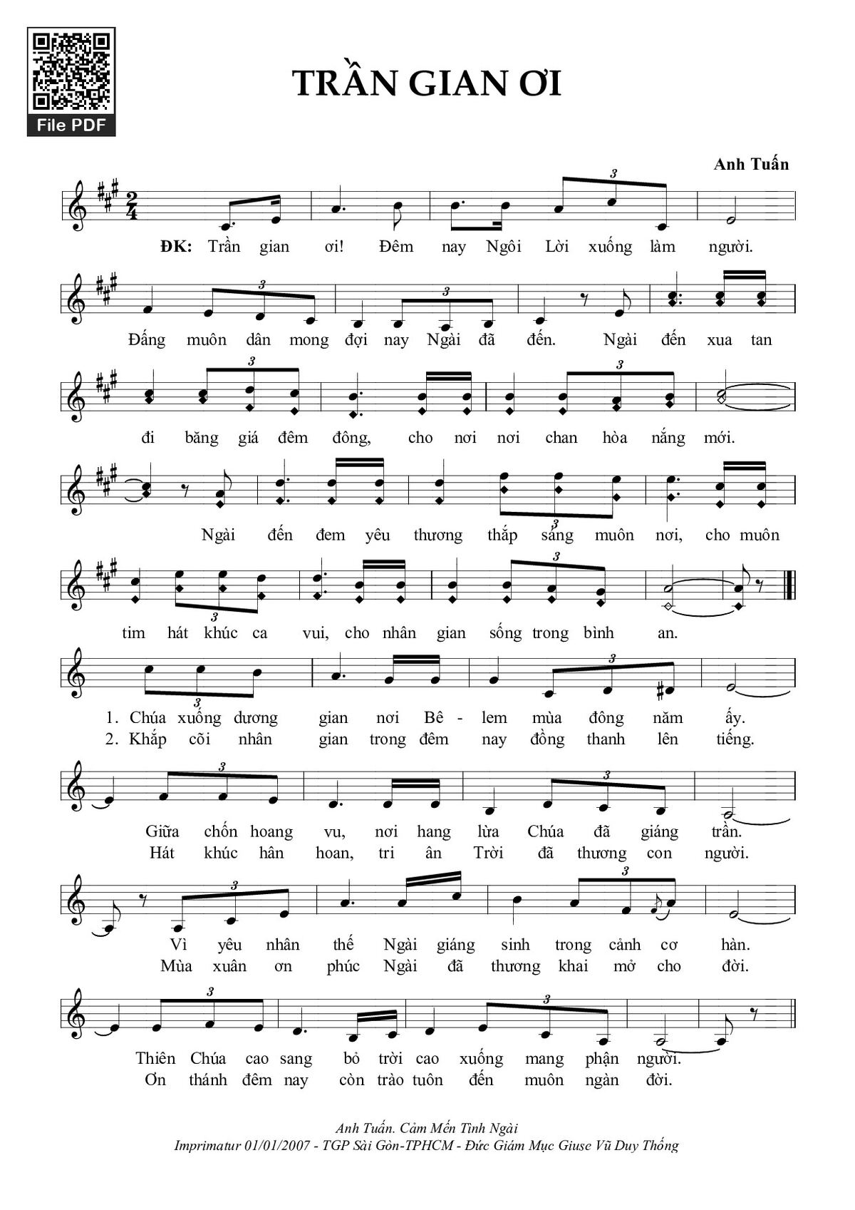 Điệp khúc: Trần gian ơi! Đêm nay Ngôi Lời xuống làm người. Đấng muôn dân mong đợi nay Ngài đã đến. Ngài đến xua tan đi băng giá đêm đông, cho nơi nơi chan hòa nắng mới. Ngài đến đem yêu thương thắp sáng muôn nơi, cho con tim hát khúc ca vui, cho nhân gian sống trong bình an.