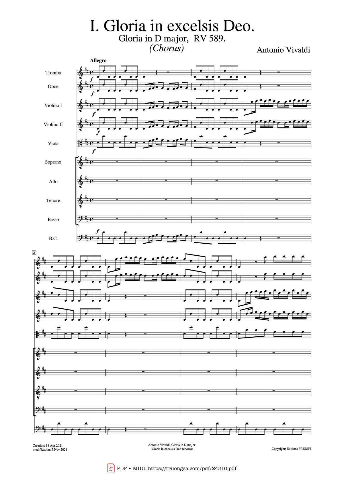 The Videos/audios Gloria in excelsis Deo (SATB Violin) by Antonio Vivaldi were embed from Youtube, Musescore or the other 3rd links. Videos are subject to 3rd's copyright control and may be removed by YouTube's copyright rules and 3rd's policies or maybe included advertisements. If you cannot access to these songs, this mean that have been removed.