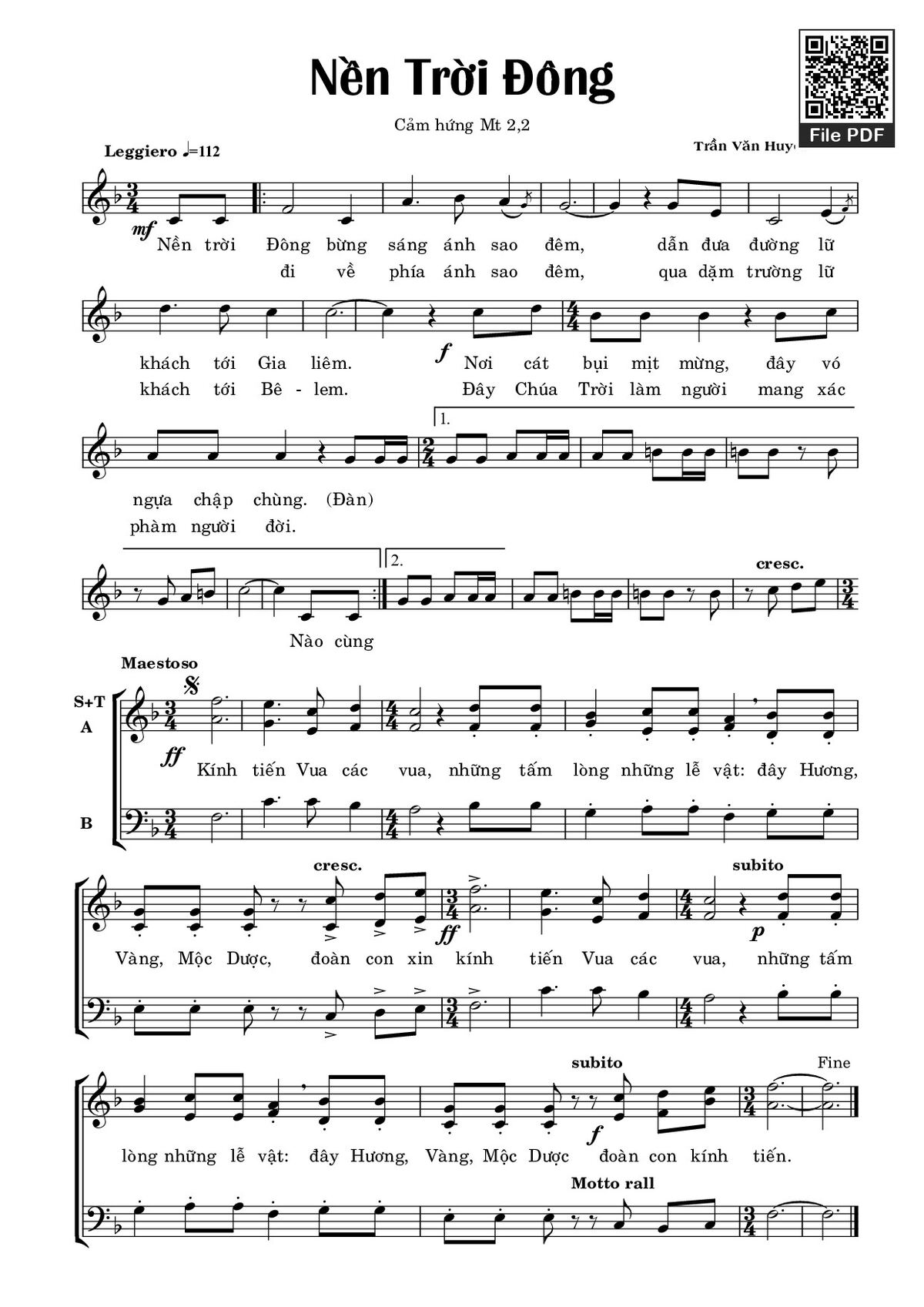 Nền trời Đông bừng sáng ánh sao đêm, dẫn đưa đường lữ khách tới Gia liêm. Nơi cát bụi mịt mừng, đây vó ngựa chập chùng. Nào cùng đi về phía ánh sao đêm, qua dặm trường lữ khách tới Bê-lem. Đây Chúa Trời làm người mang xác phàm người đời. Kính tiến Vua các vua, những tấm lòng những lễ vật: đây Hương, Vàng, Mộc Dược, đoàn con xin kính tiến Vua các vua, những tấm lòng những lễ vật: đây Hương, Vàng, Mộc Dược đoàn con kính tiến.