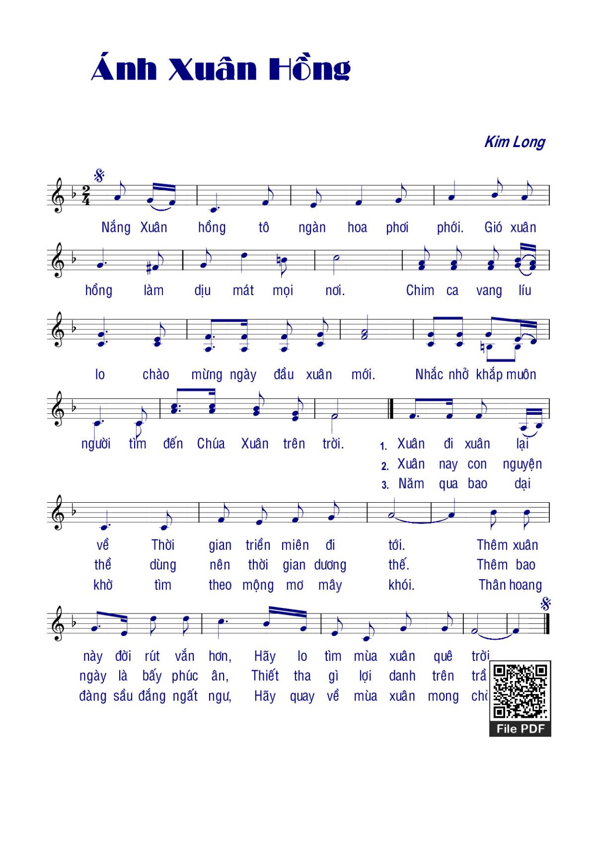 Sheet music Ánh xuân hồng by Kim Long and PDF file was posted here to support you to practice singing perfectly. Sheets with notes and chords are for reference only, for non-commercial purposes only, not involved with earning money by buying and selling. Copyright is belong to song writer/author and copyright owner. Truongca.com do not own any copyrighted content. You can download the high-quality PDF files which contain staffs by PDF link above.