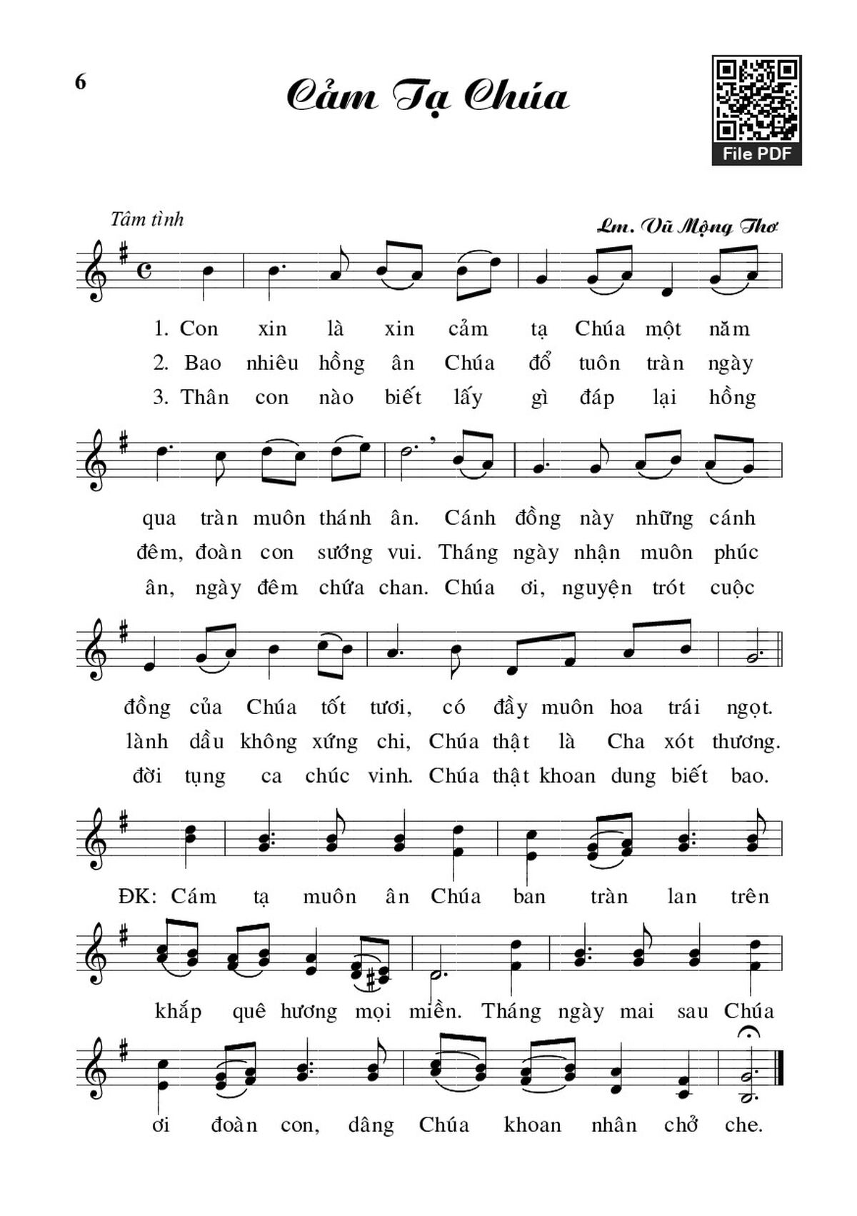 Sheet music Cảm tạ Chúa by Vũ Mộng Thơ and PDF file was posted here to support you to practice singing perfectly. Sheets with notes and chords are for reference only, for non-commercial purposes only, not involved with earning money by buying and selling. Copyright is belong to song writer/author and copyright owner. Truongca.com do not own any copyrighted content. You can download the high-quality PDF files which contain staffs by PDF link above.