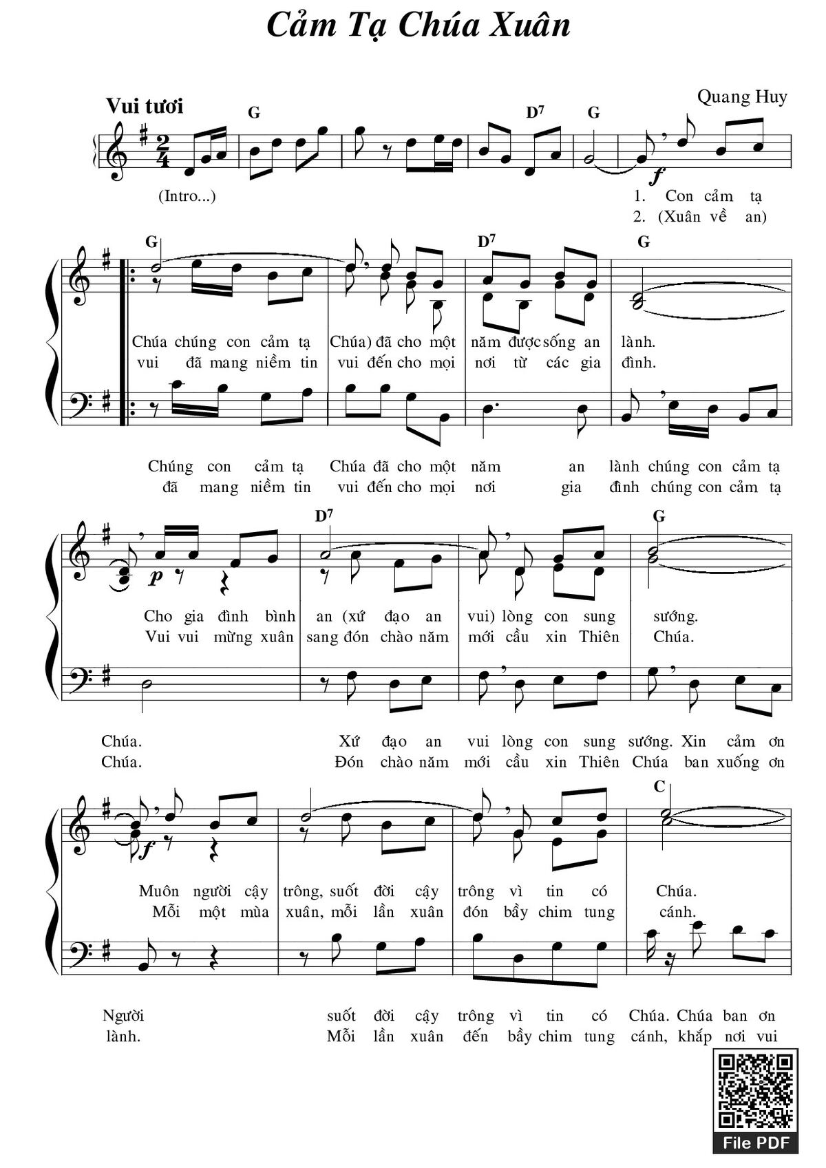 Sheet music Cảm tạ Chúa Xuân by Quang Huy and PDF file was posted here to support you to practice singing perfectly. Sheets with notes and chords are for reference only, for non-commercial purposes only, not involved with earning money by buying and selling. Copyright is belong to song writer/author and copyright owner. Truongca.com do not own any copyrighted content. You can download the high-quality PDF files which contain staffs by PDF link above.