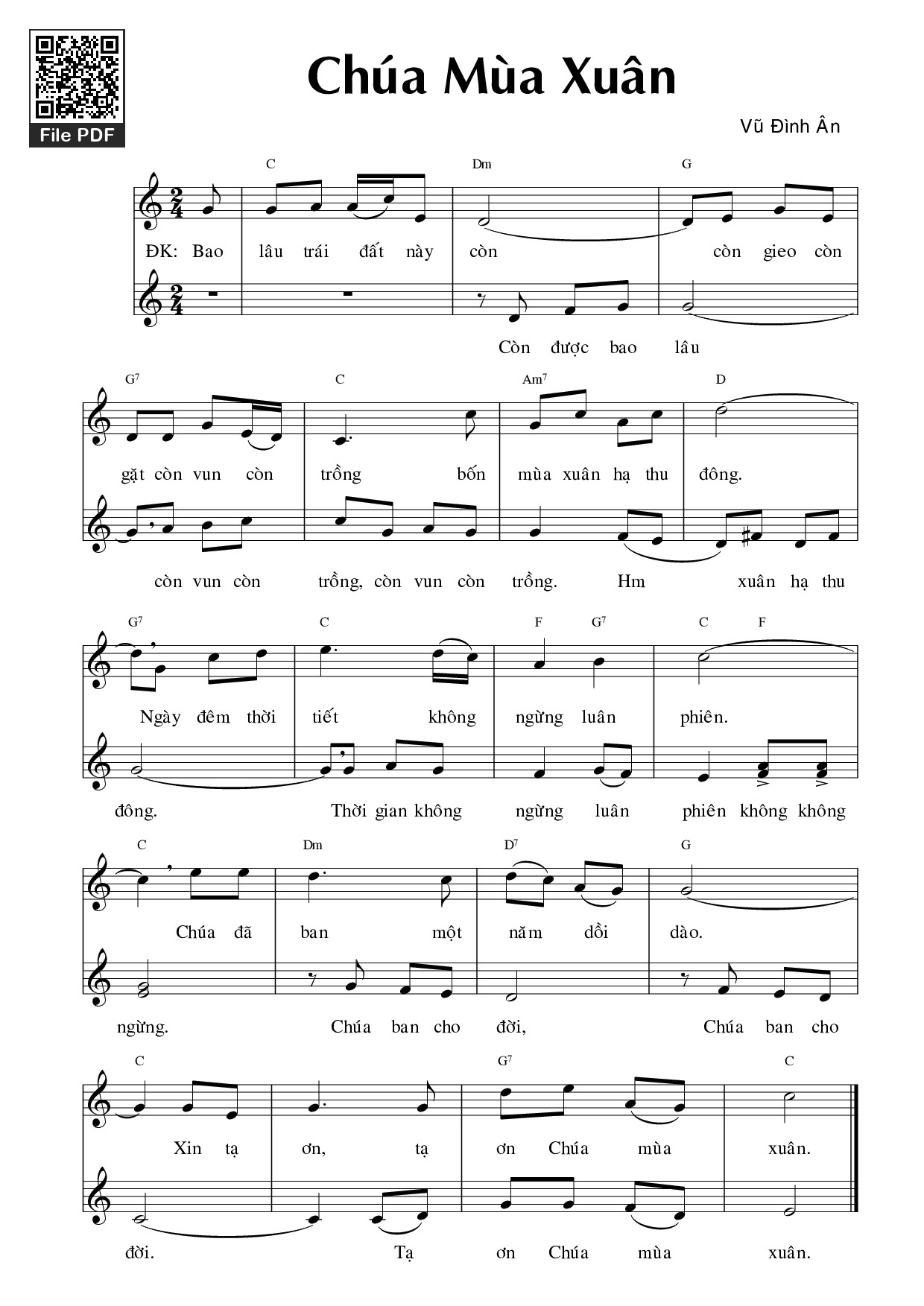 Sheet music Chúa mùa xuân by Vũ Đình Ân and PDF file was posted here to support you to practice singing perfectly. Sheets with notes and chords are for reference only, for non-commercial purposes only, not involved with earning money by buying and selling. Copyright is belong to song writer/author and copyright owner. Truongca.com do not own any copyrighted content. You can download the high-quality PDF files which contain staffs by PDF link above.