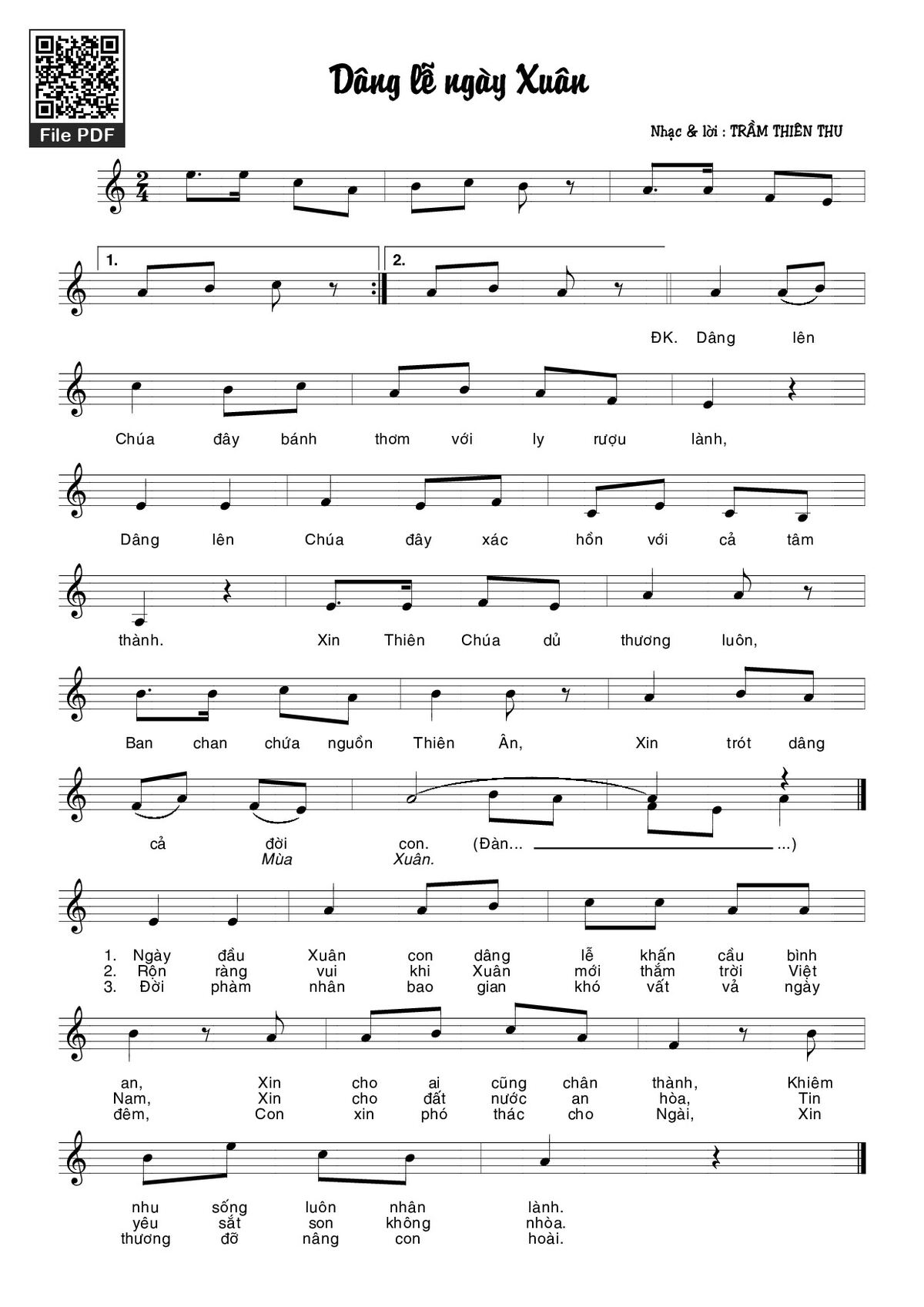 Sheet music Dâng lễ ngày xuân by Trầm Thiên Thu and PDF file was posted here to support you to practice singing perfectly. Sheets with notes and chords are for reference only, for non-commercial purposes only, not involved with earning money by buying and selling. Copyright is belong to song writer/author and copyright owner. Truongca.com do not own any copyrighted content. You can download the high-quality PDF files which contain staffs by PDF link above.