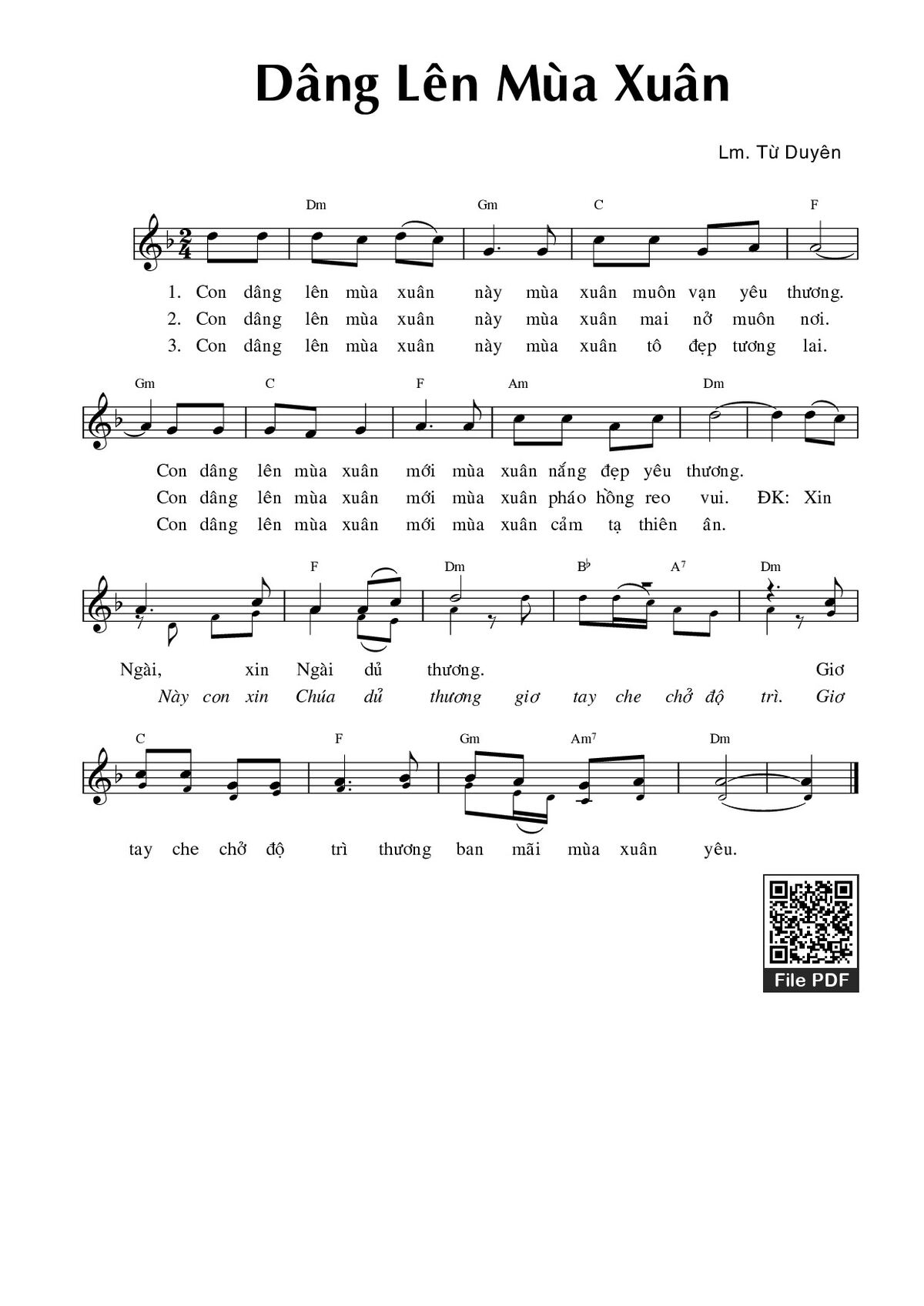 Sheet music Dâng lên mùa xuân by Từ Duyên and PDF file was posted here to support you to practice singing perfectly. Sheets with notes and chords are for reference only, for non-commercial purposes only, not involved with earning money by buying and selling. Copyright is belong to song writer/author and copyright owner. Truongca.com do not own any copyrighted content. You can download the high-quality PDF files which contain staffs by PDF link above.