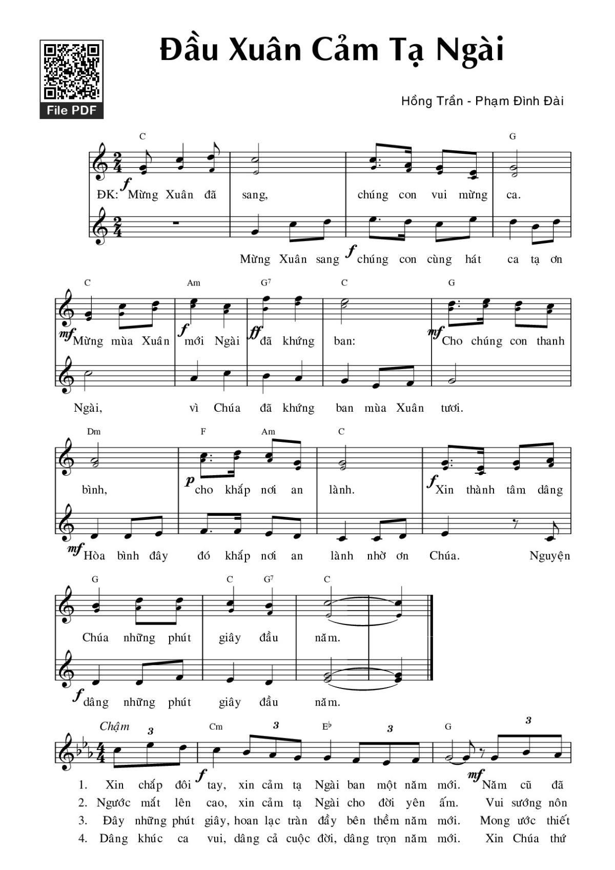 Sheet music Đầu xuân cảm tạ Ngài by Hồng Trần and PDF file was posted here to support you to practice singing perfectly. Sheets with notes and chords are for reference only, for non-commercial purposes only, not involved with earning money by buying and selling. Copyright is belong to song writer/author and copyright owner. Truongca.com do not own any copyrighted content. You can download the high-quality PDF files which contain staffs by PDF link above.